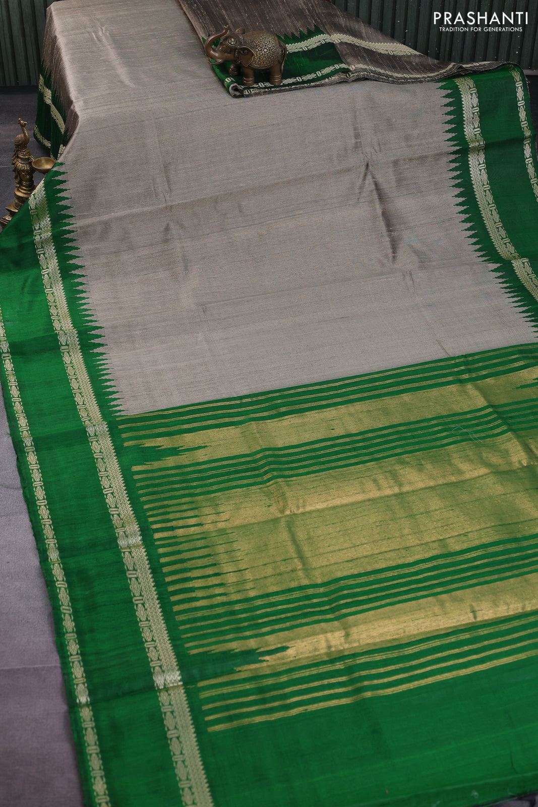 Pure dupion silk saree grey and green with plain body and temple design rettapet zari woven border