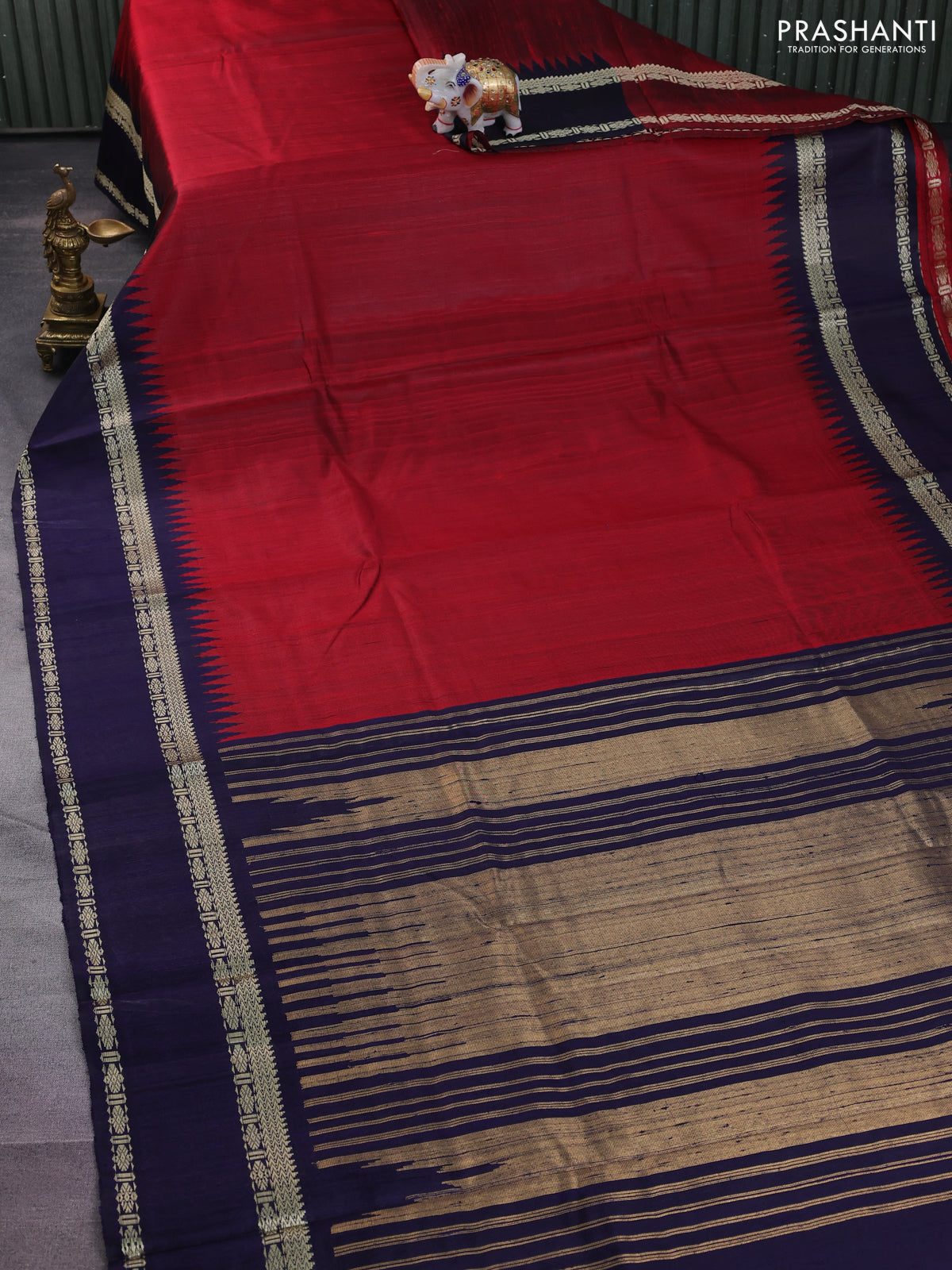 Pure dupion silk saree maroon and navy blue with plain body and temple design rettapet thread woven border