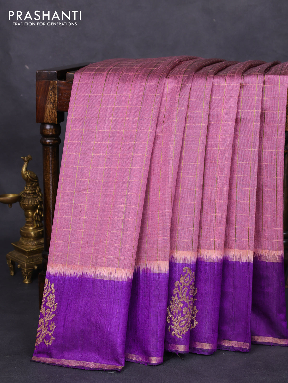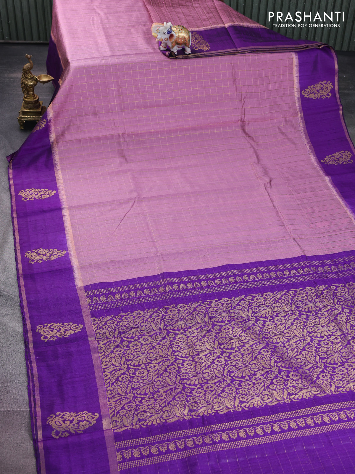 Pure dupion silk saree mauve pink and violet with allover zari checked pattern and zari woven butta border