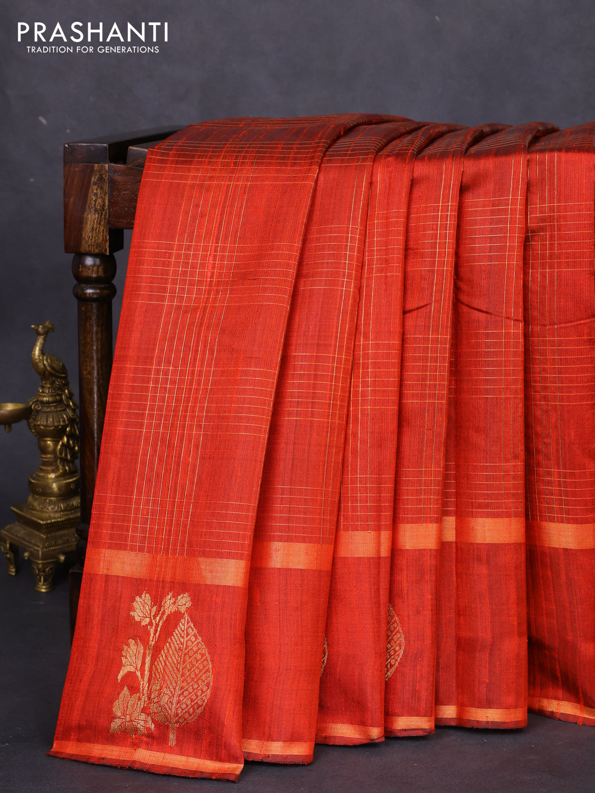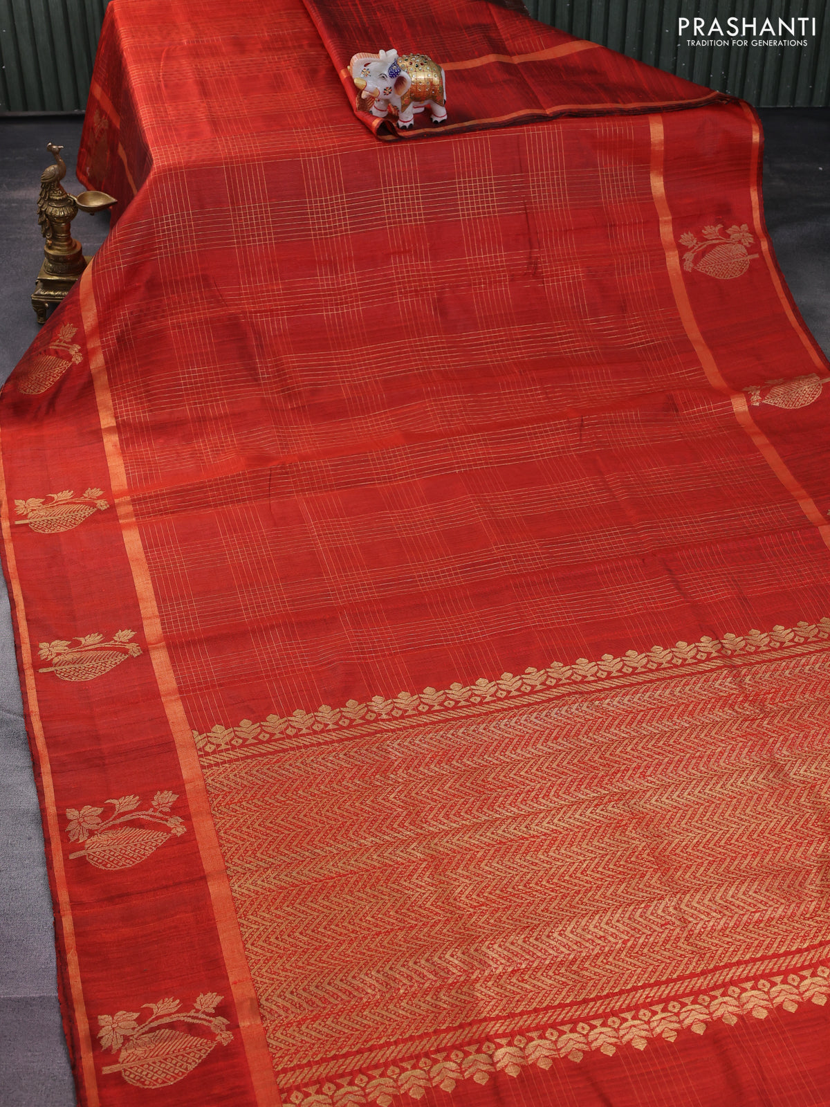 Pure dupion silk saree orange with allover zari checked pattern and zari woven butta border