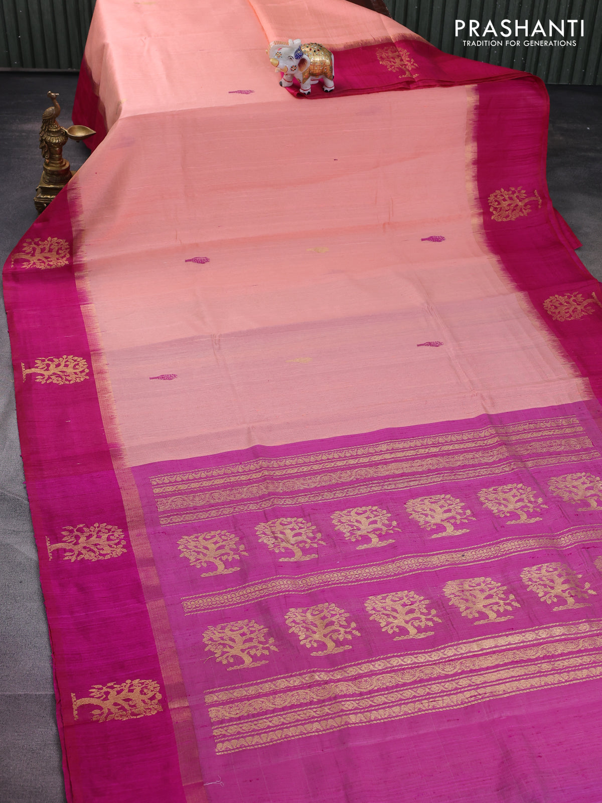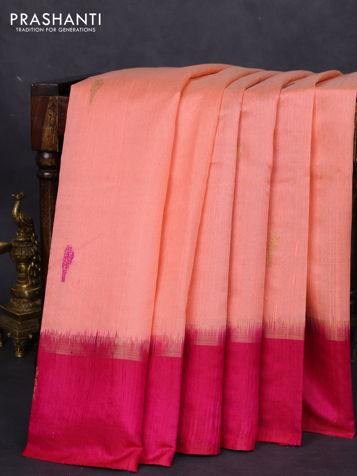 Pure dupion silk saree peach orange and pink with thread woven buttas and zari woven butta border