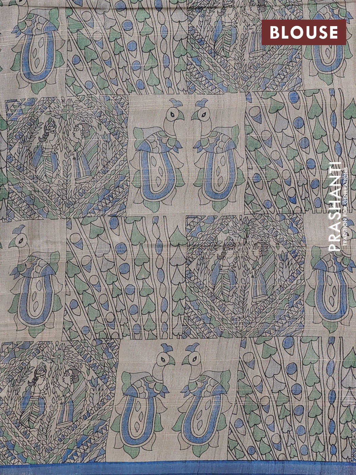 Pure dupion silk saree peacock blue and beige with allover zari checked pattern and madhubani printed pallu & blouse