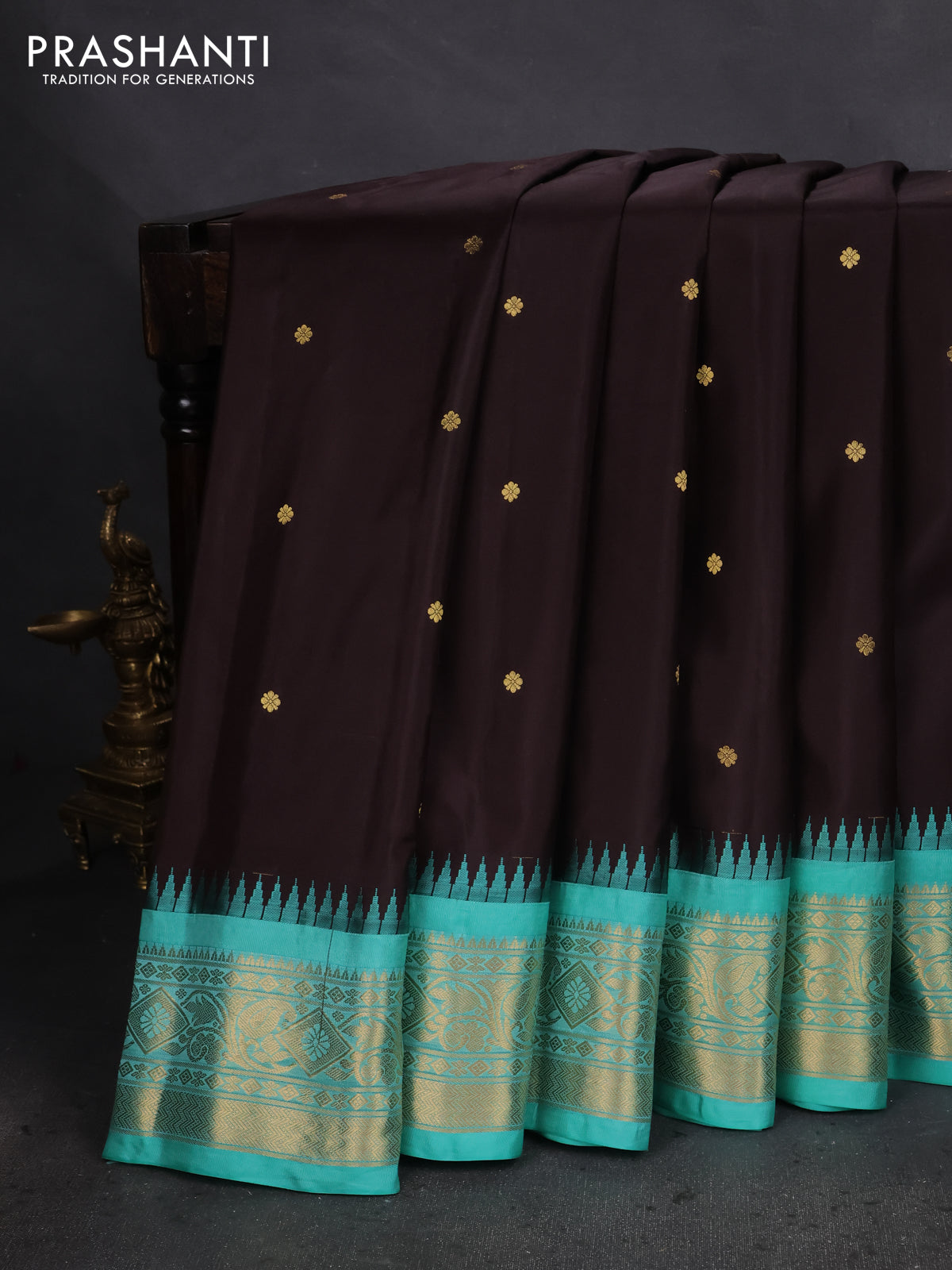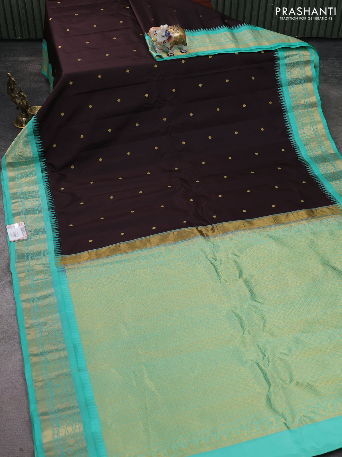 Pure gadwal silk saree coffe brown and teal green with zari woven buttas and temple design zari woven border