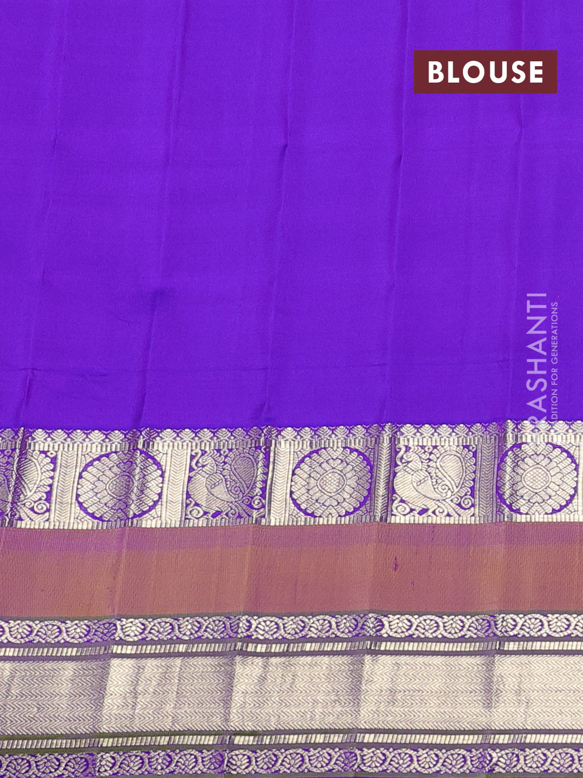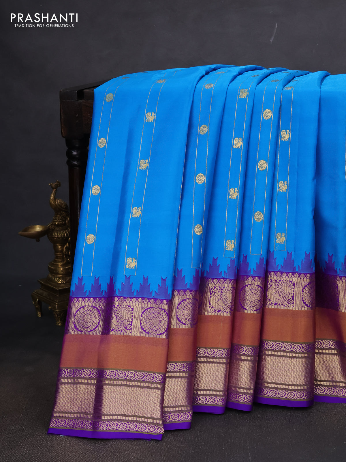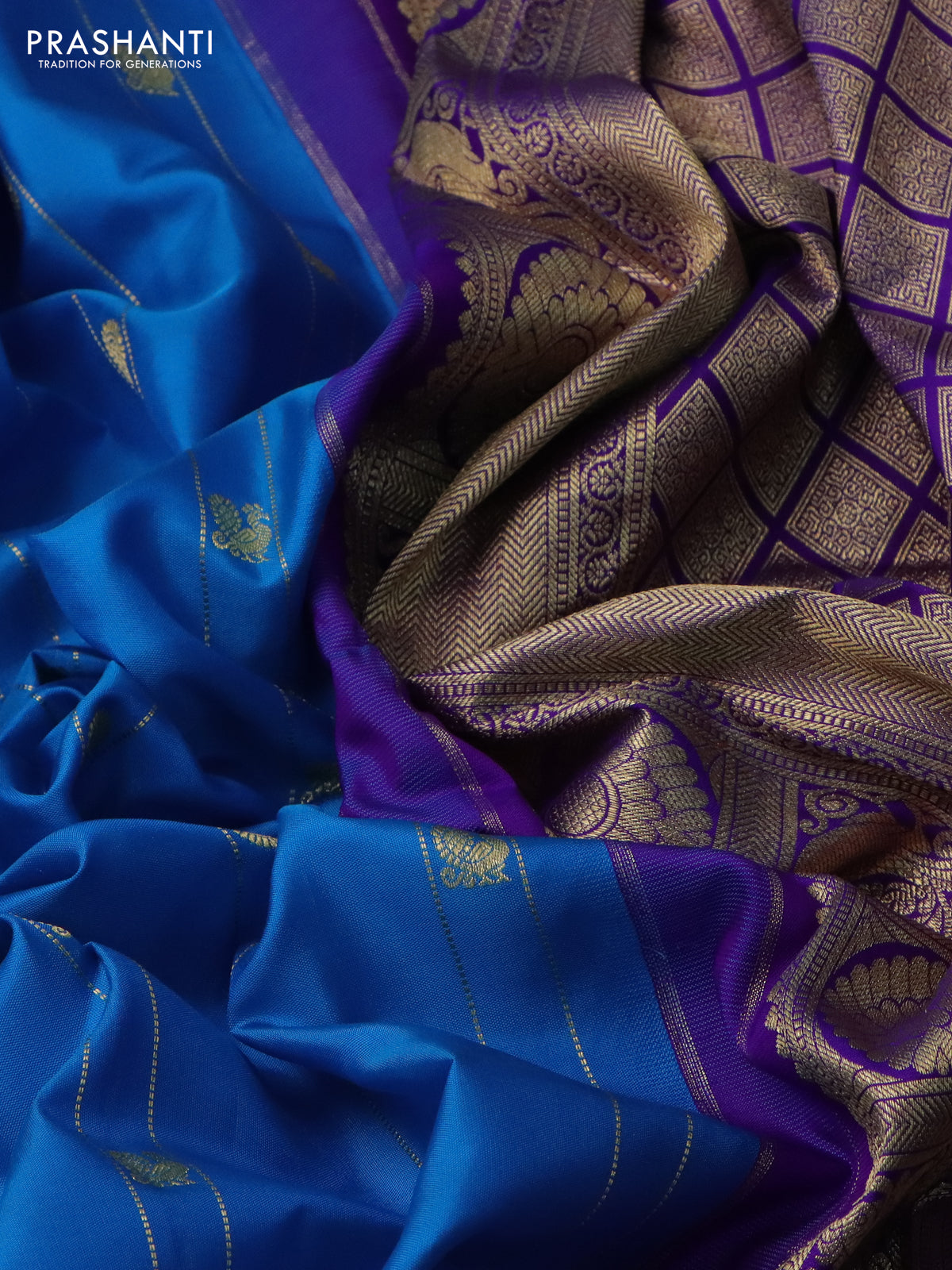 Pure gadwal silk saree cs blue and violet with allover zari weaves & buttas and long temple design rettapet zari woven border
