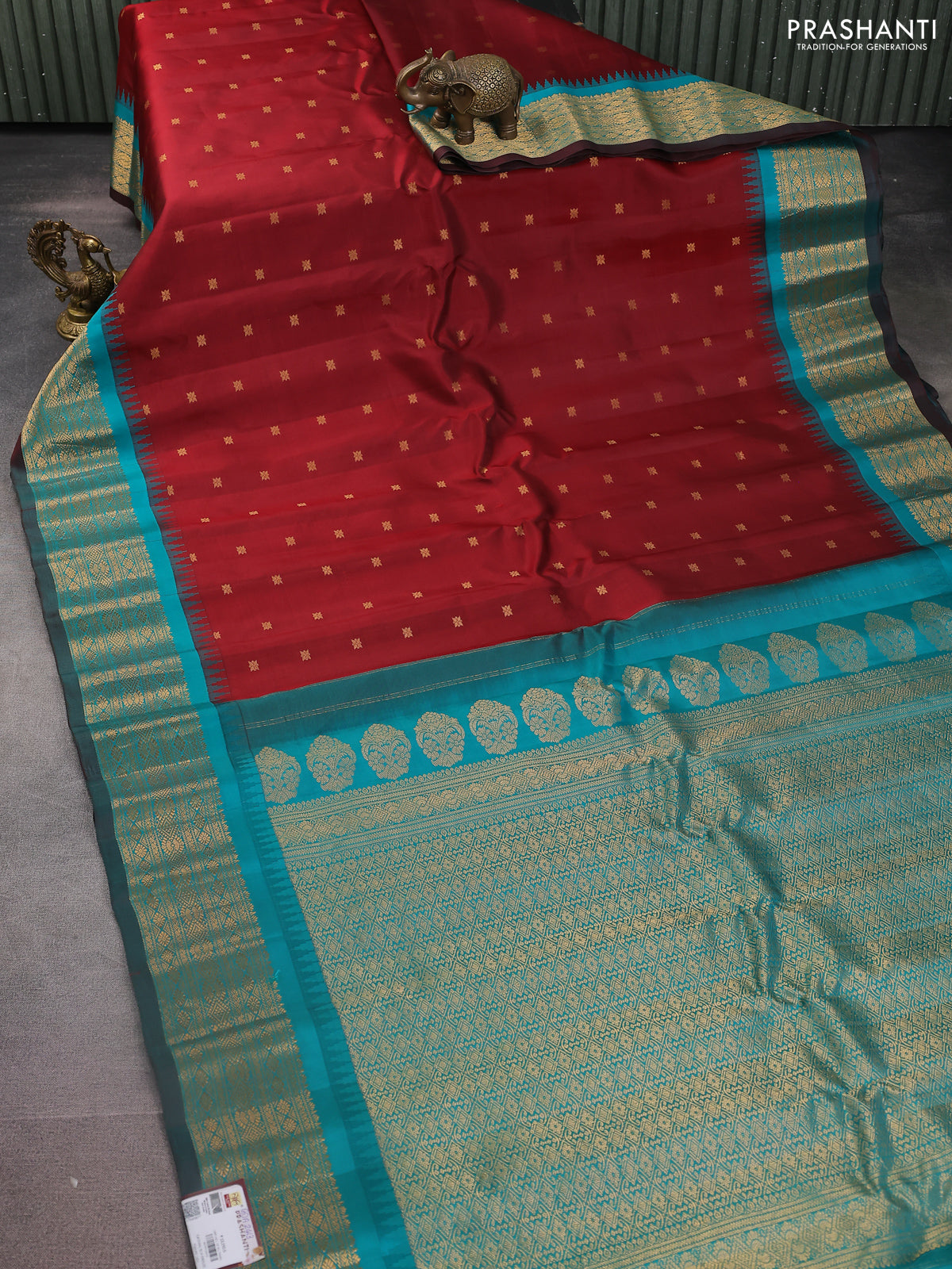 Pure gadwal silk saree maroon and peacock green with zari woven buttas and temple design zari woven border