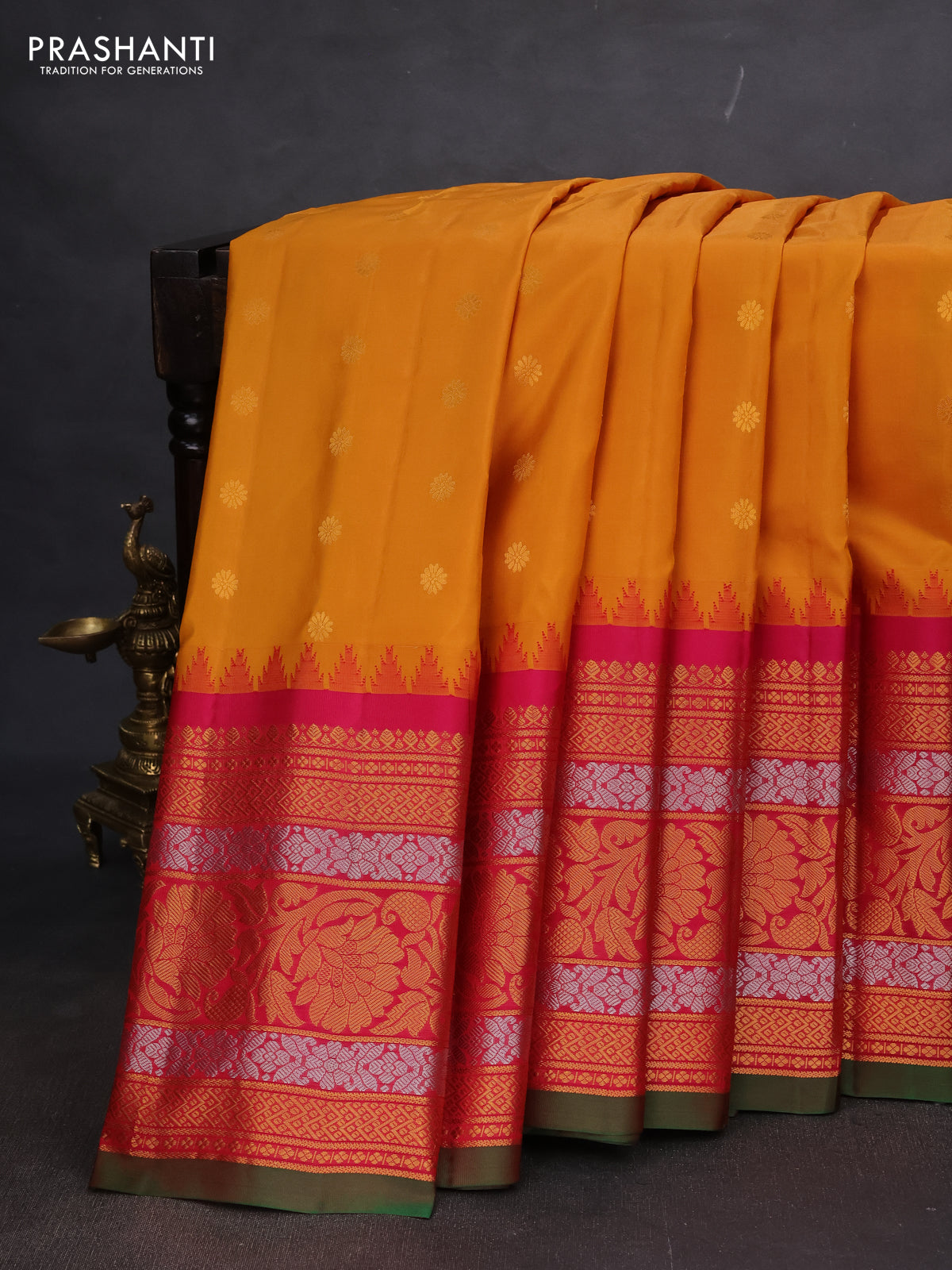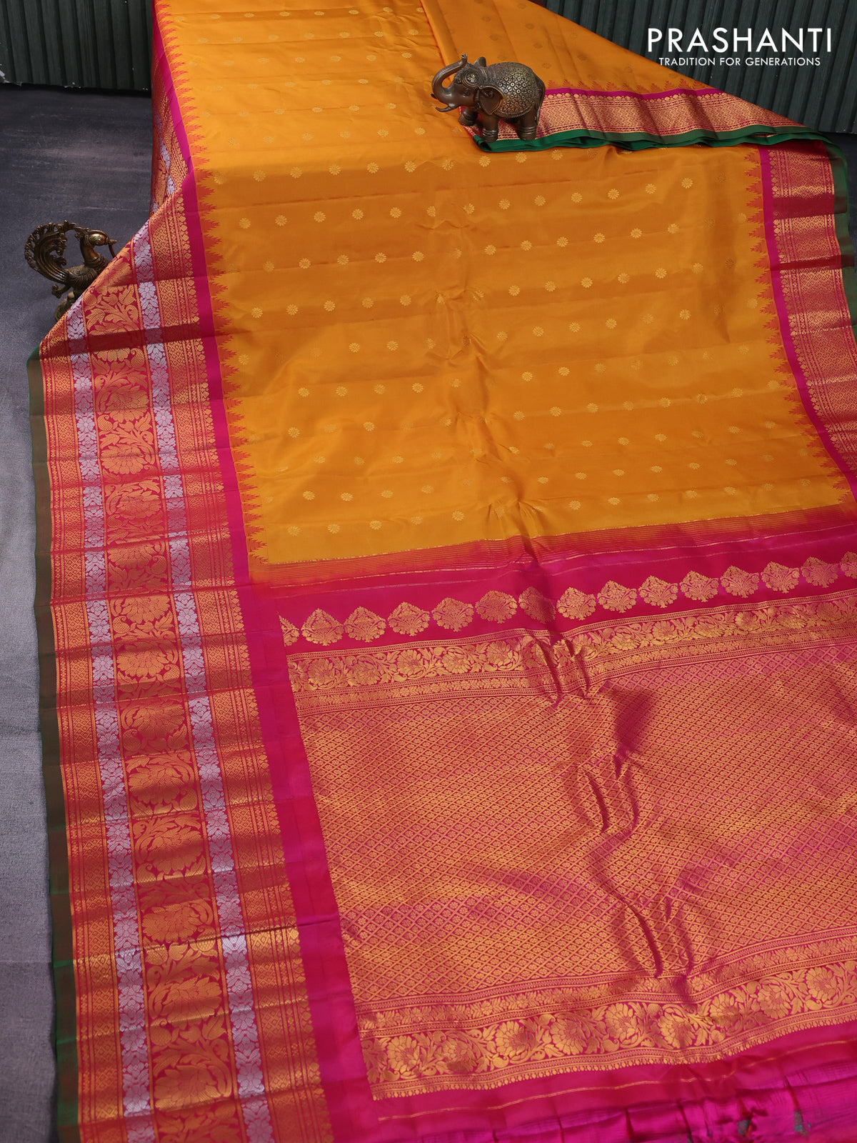 Pure gadwal silk saree mustard yellow and pink with zari woven buttas and temple design long zari woven border