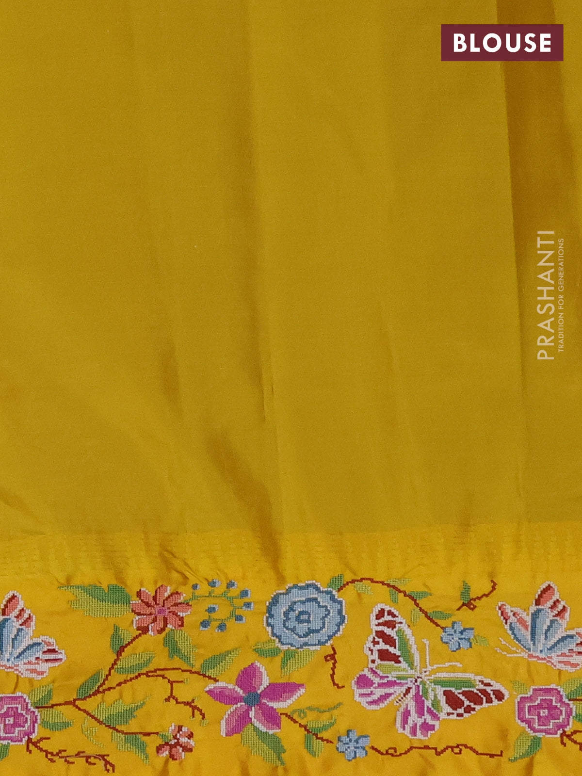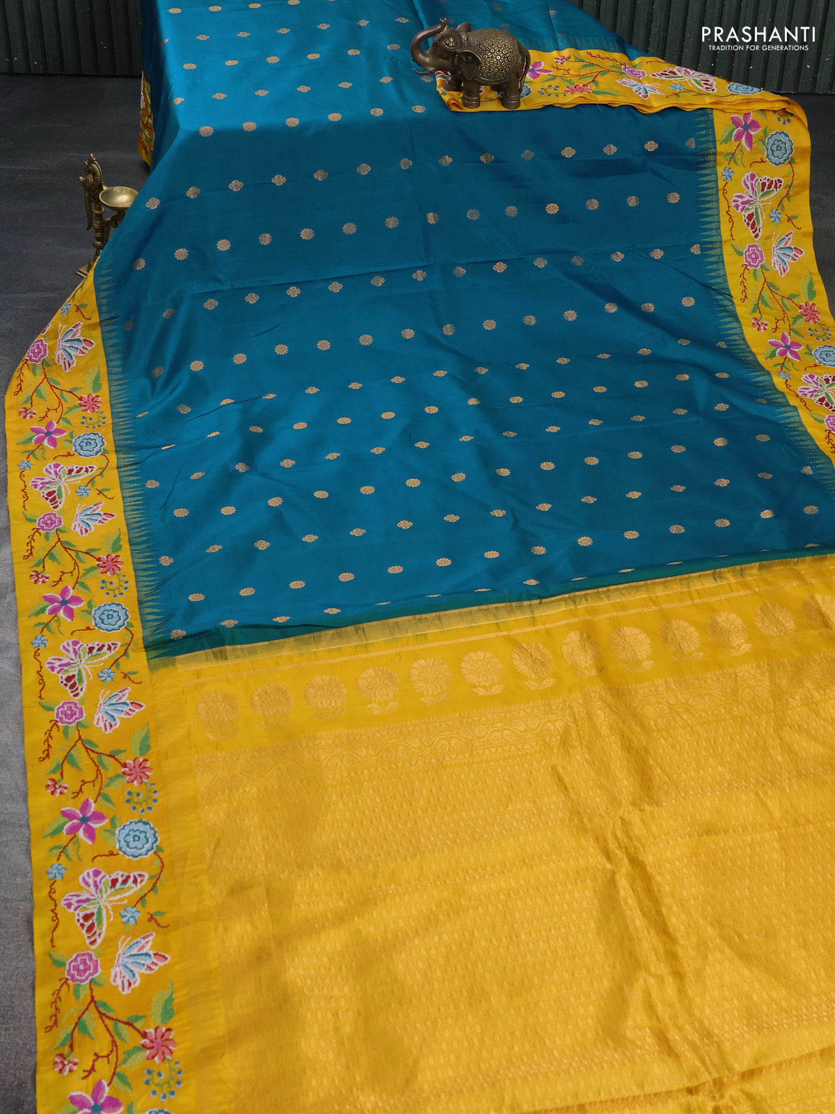 Pure gadwal silk saree peacock blue and mango yellow with zari woven buttas and temple design convent embroidery border