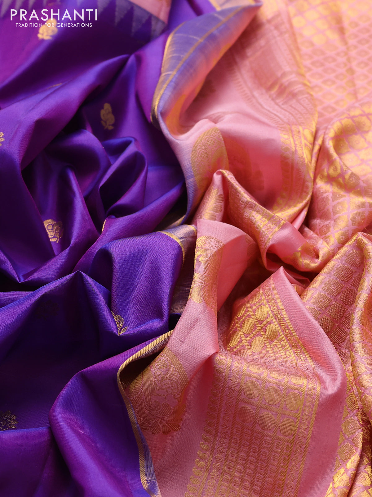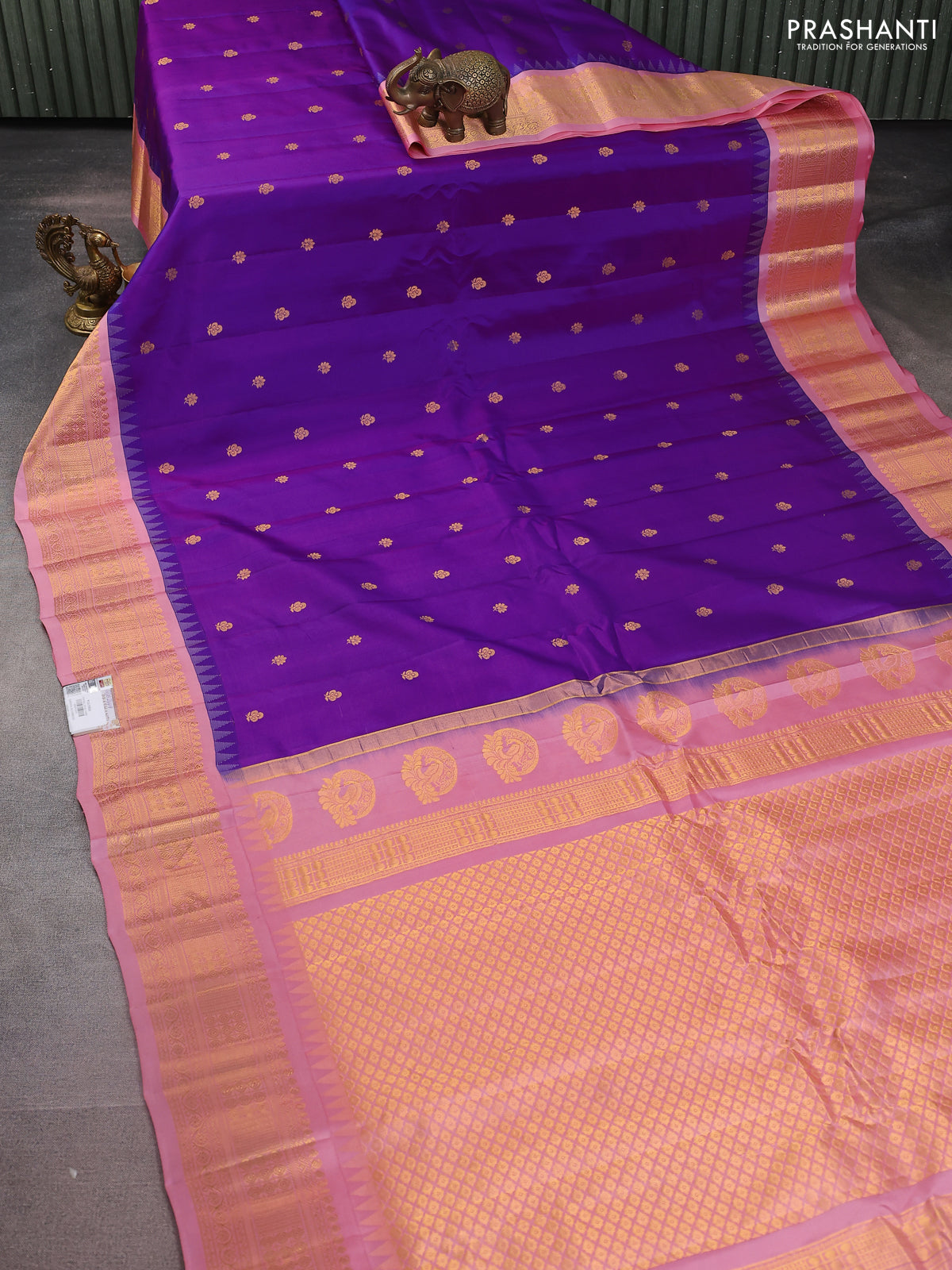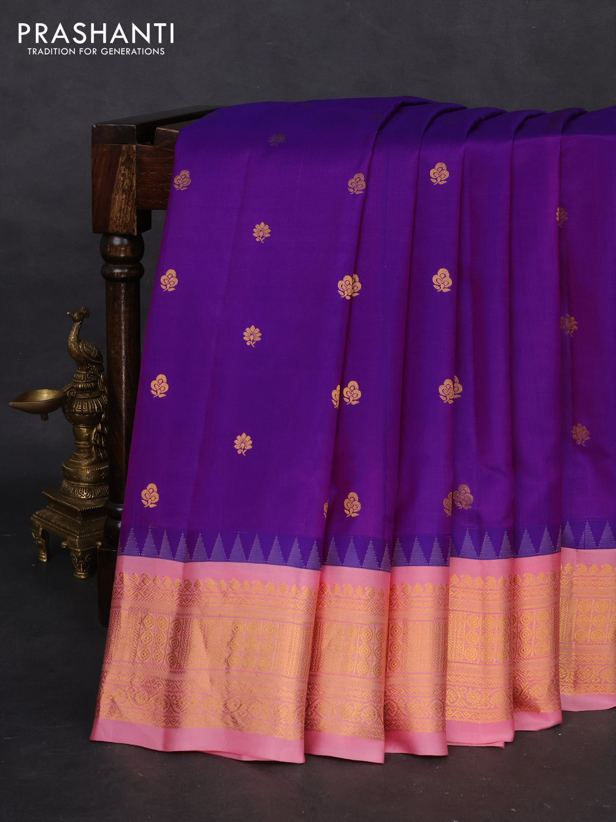 Pure gadwal silk saree purple and peach pink shade with zari woven buttas and temple design zari woven border