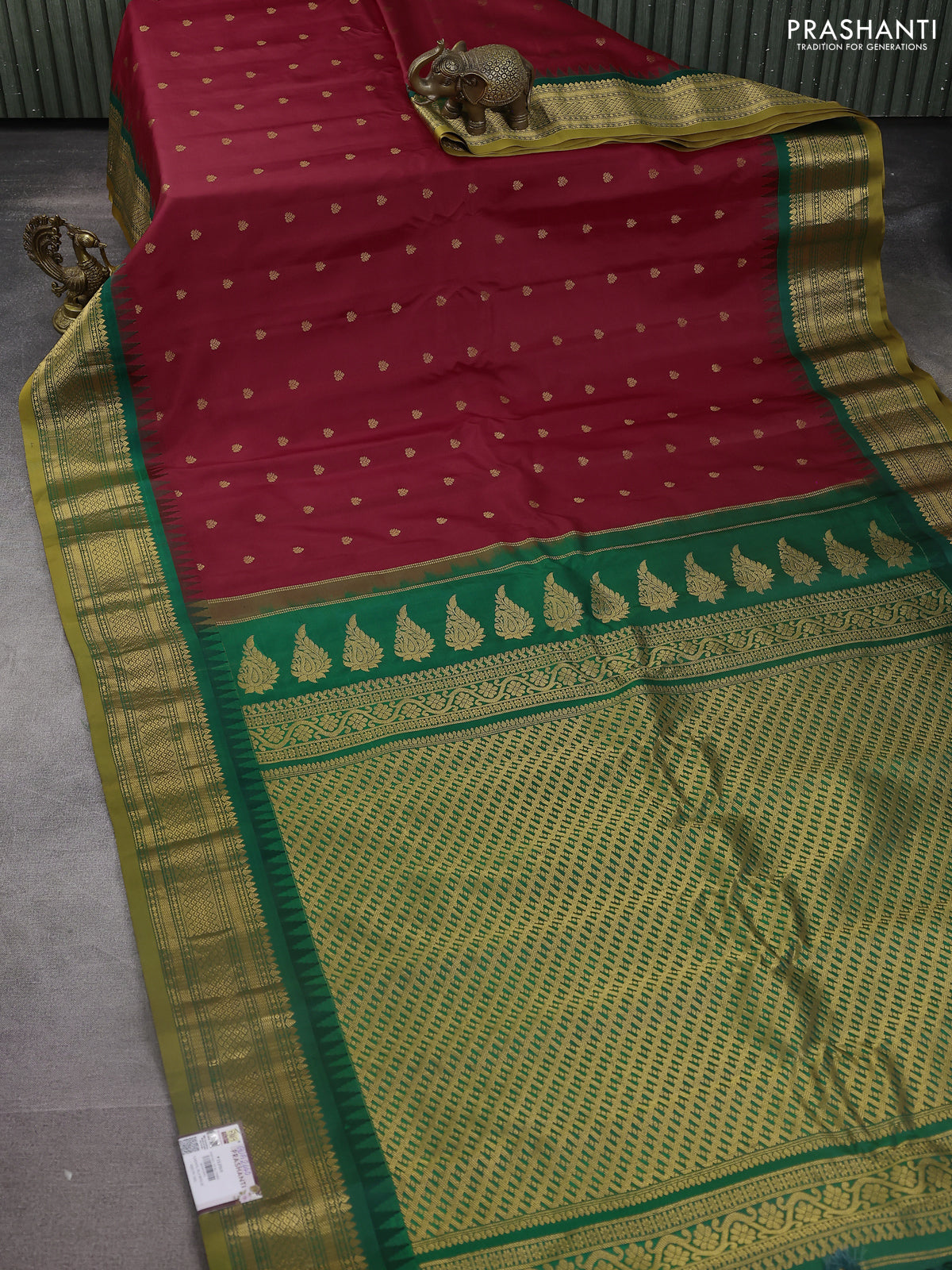 Pure gadwal silk saree red and green with zari woven buttas and temple design zari woven border