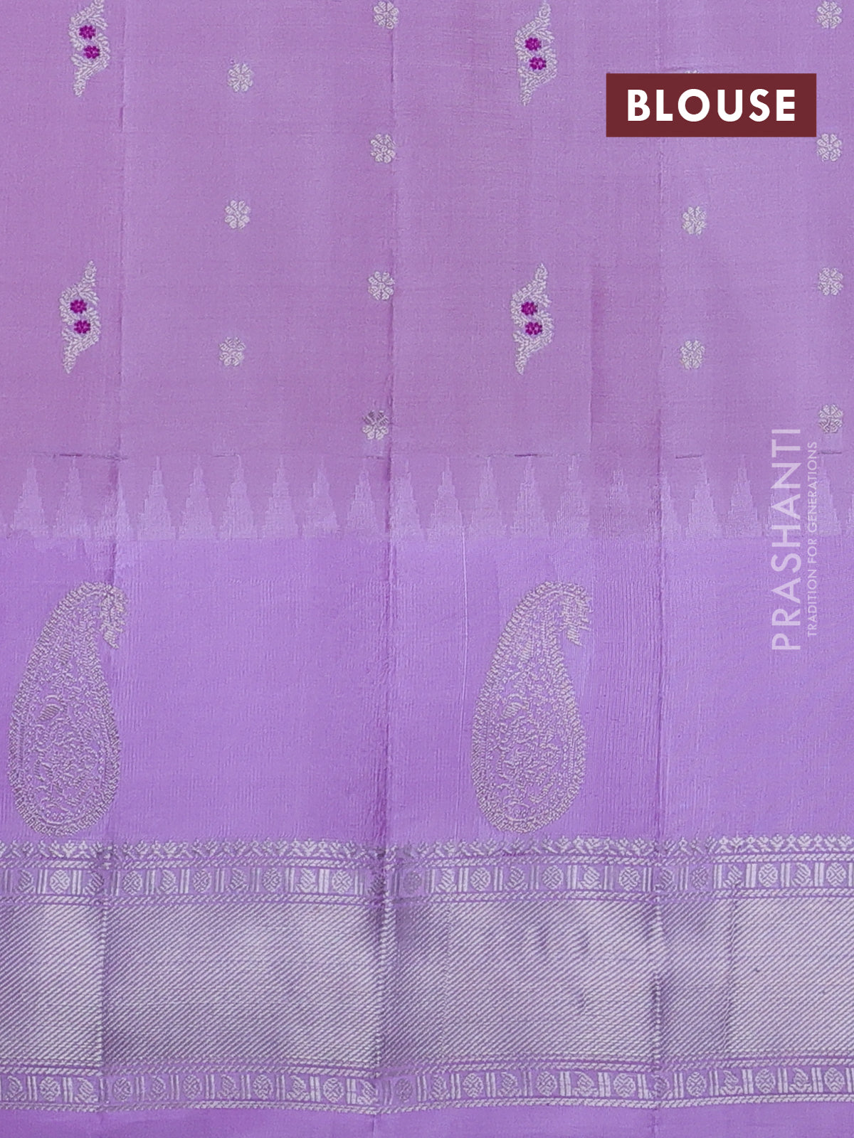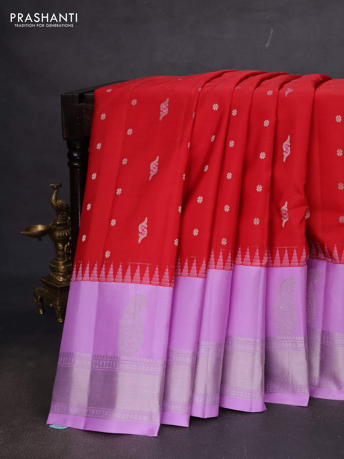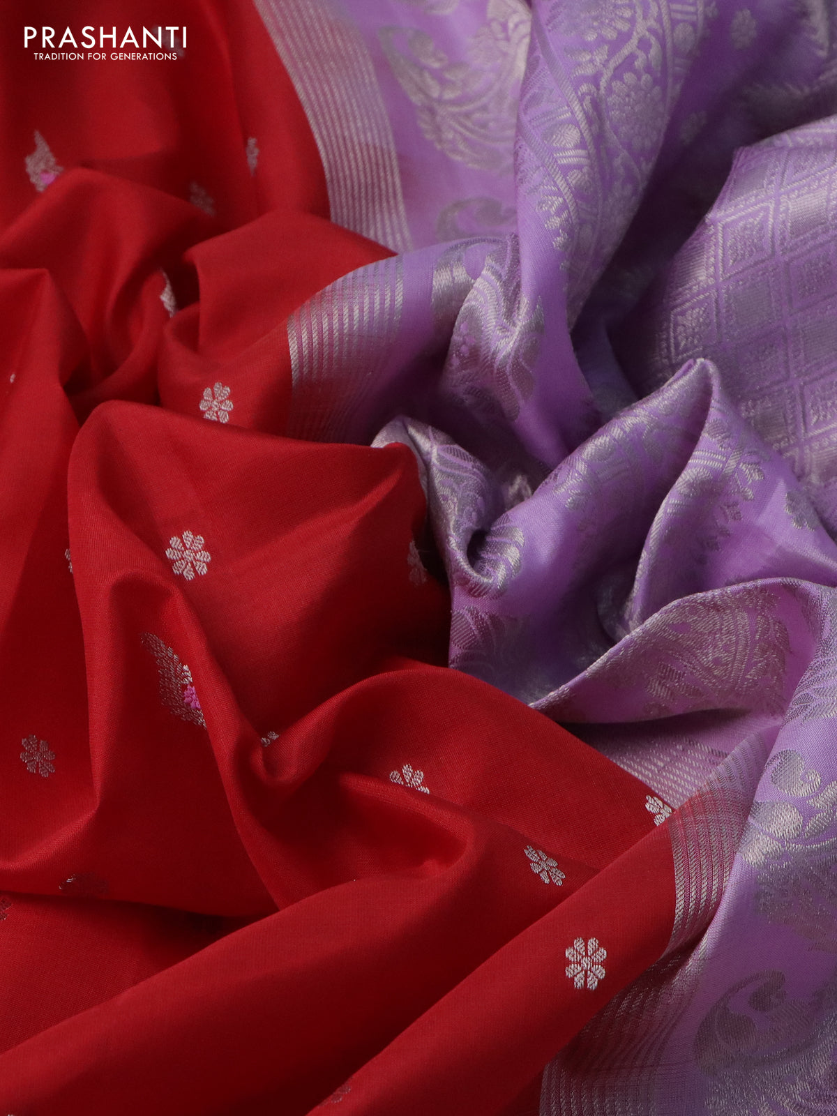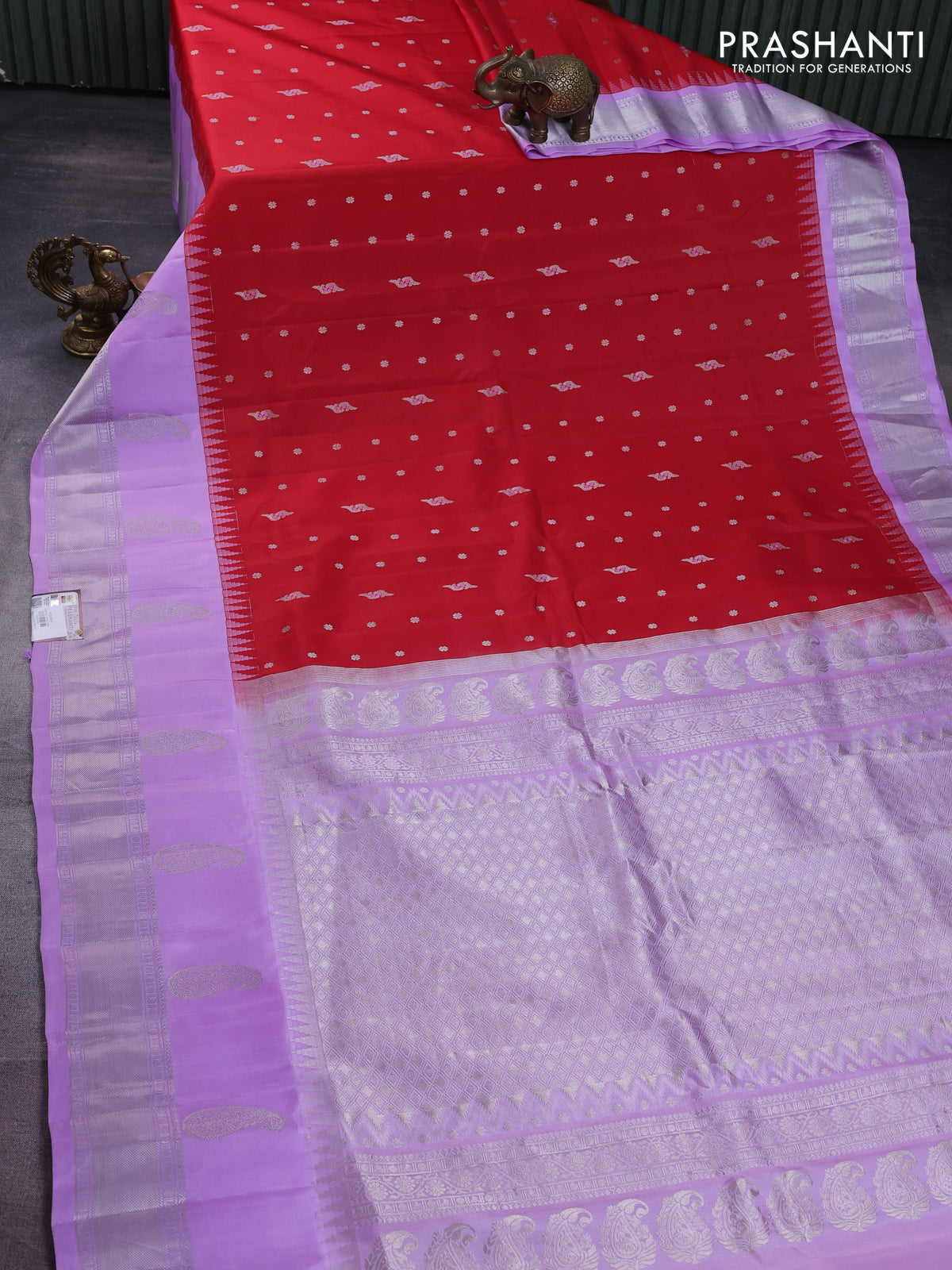 Pure gadwal silk saree red and lavender with silver zari woven buttas and temple design silver zari woven border