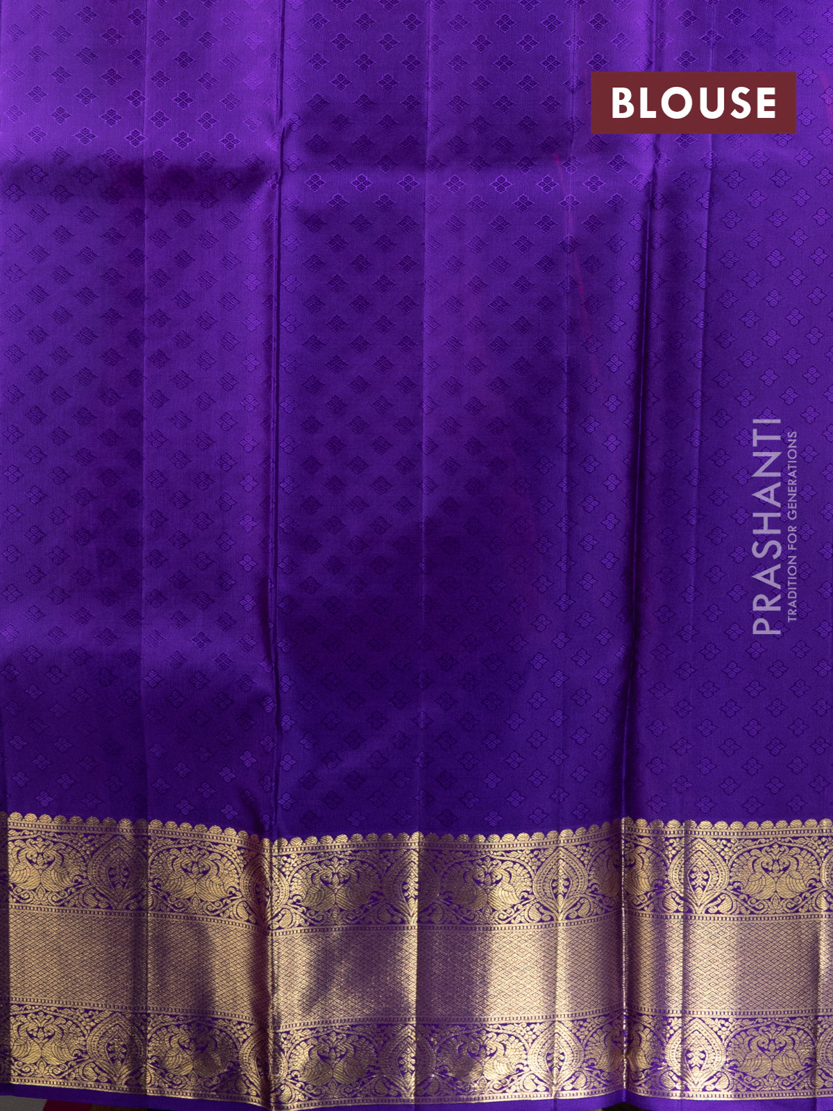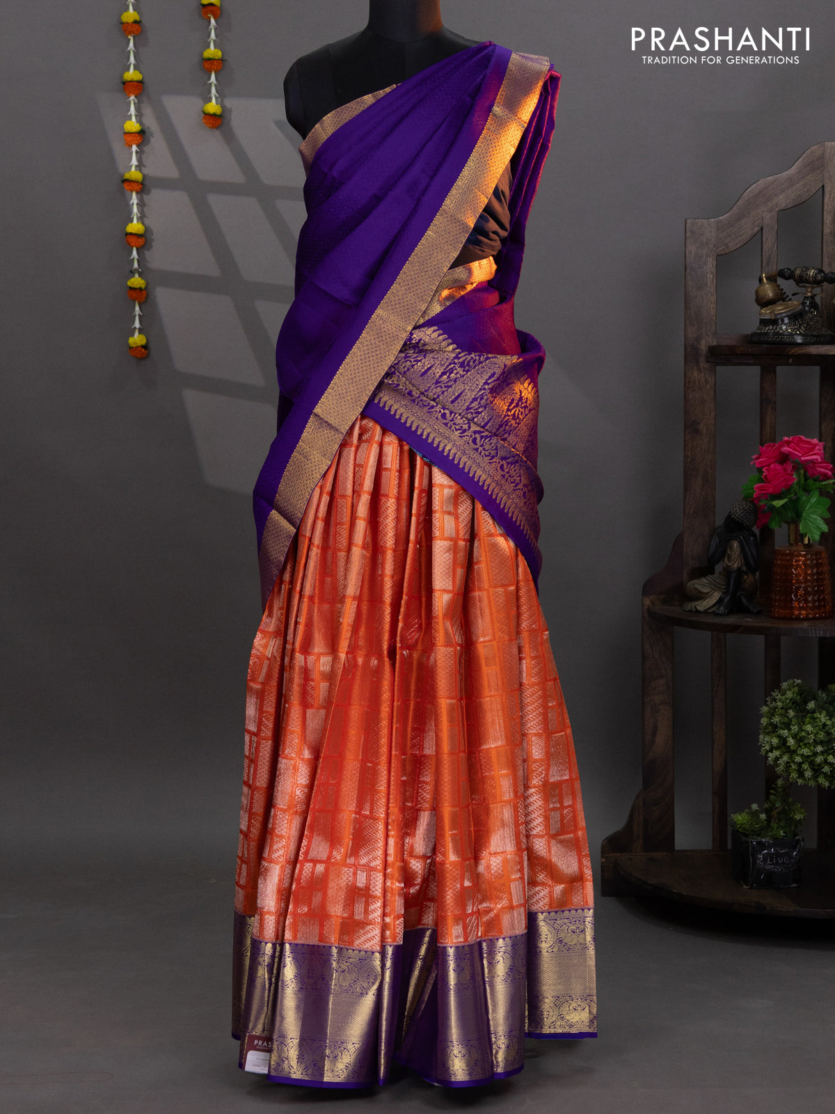Pure kanchipuram silk lehenga orange and violet with allover silver zari woven brocade weaves and annam zari woven border