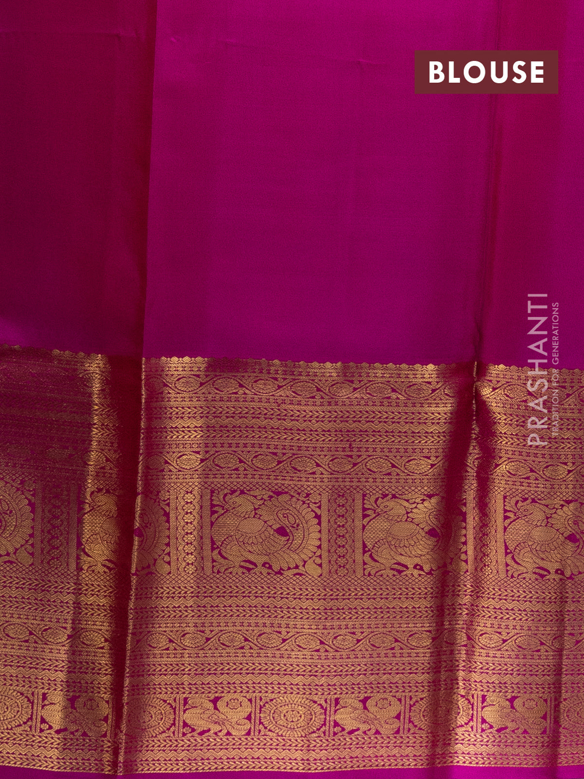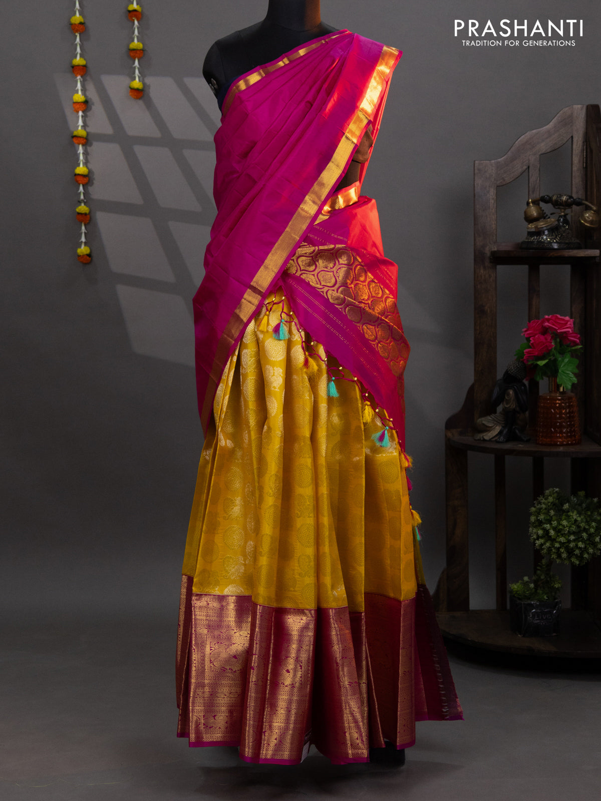 Pure kanchipuram silk lehenga yellow and pink with allover silver zari woven annam mayil chakkaram buttas and long annam zari woven border