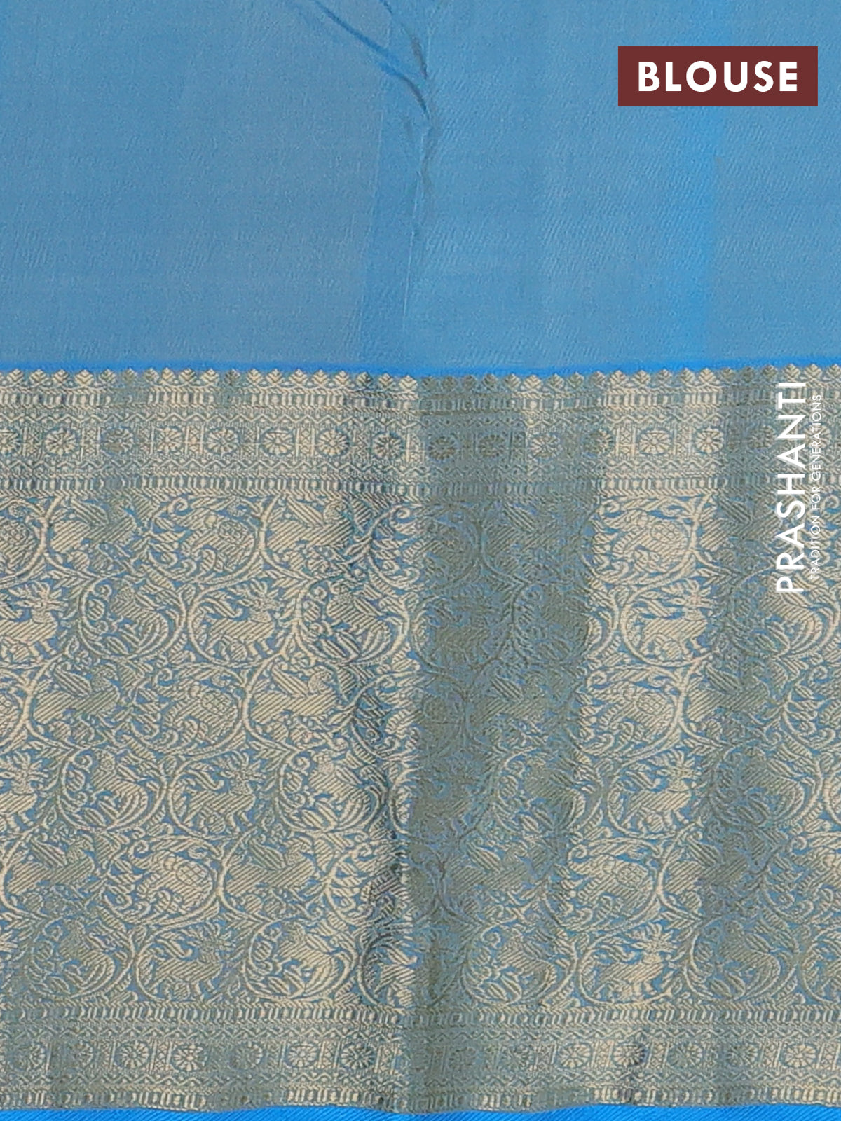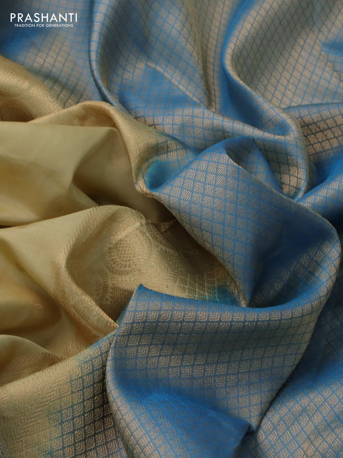 Pure kanchipuram silk saree beige and dual shade of blue with allover zari woven buttas and long rich zari woven border