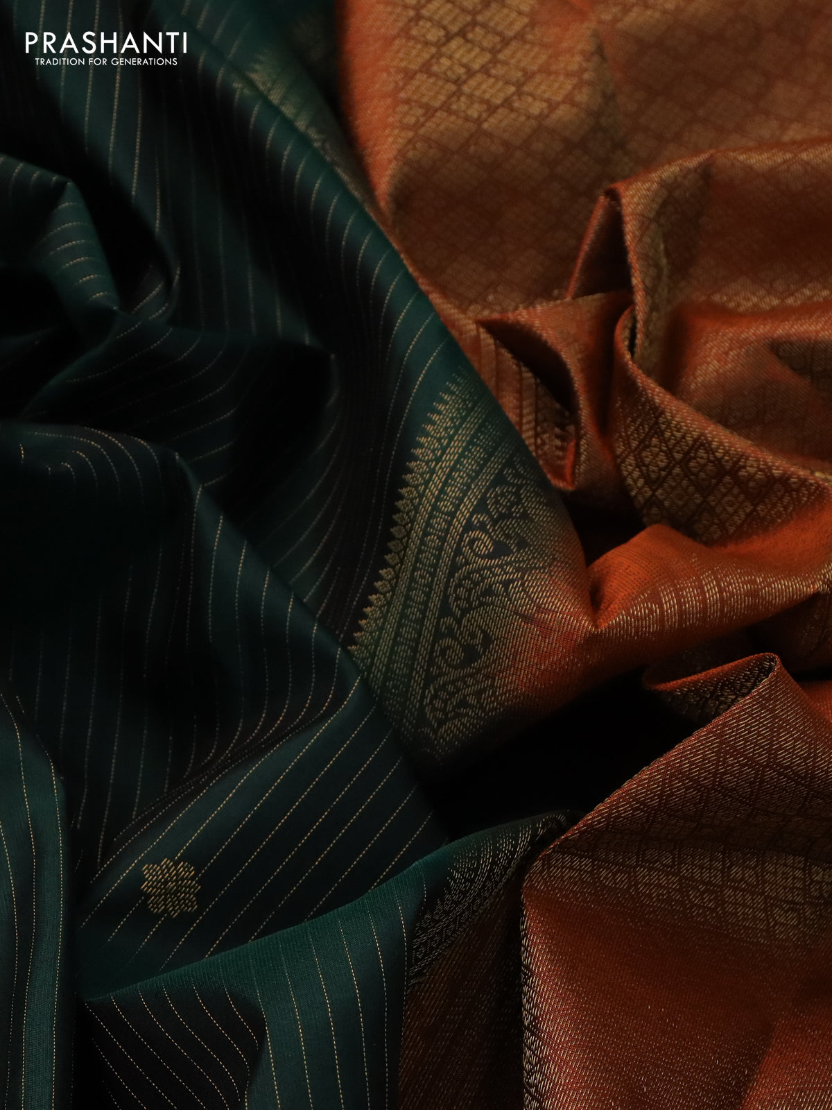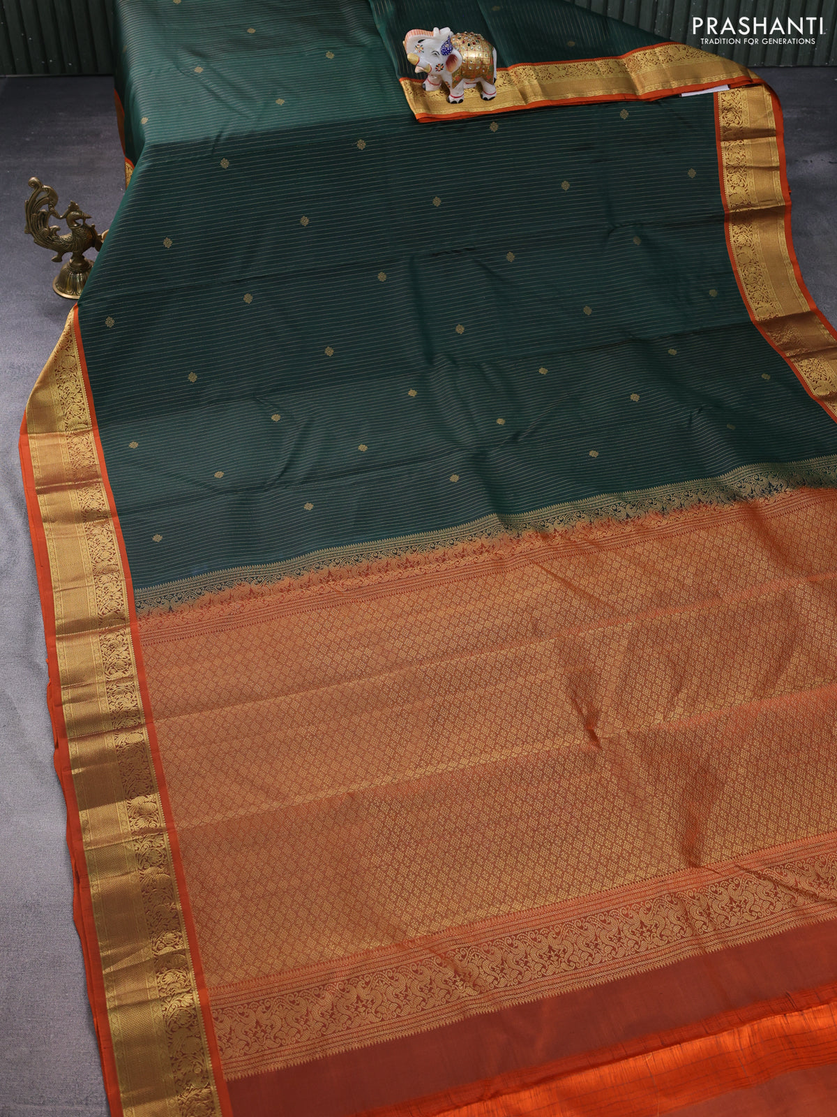 Pure kanchipuram silk saree bottle green and orange with allover zari weaves & buttas and rich zari woven border