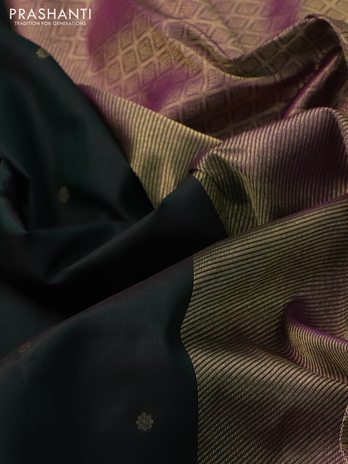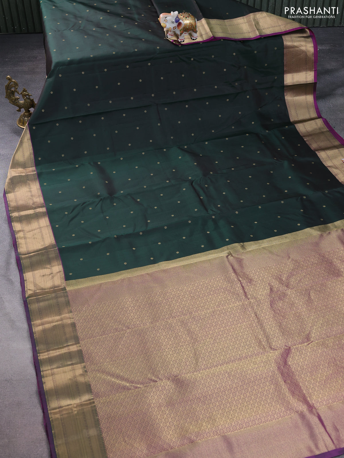 Pure kanchipuram silk saree bottle green and purple with zari woven buttas and rich zari woven border