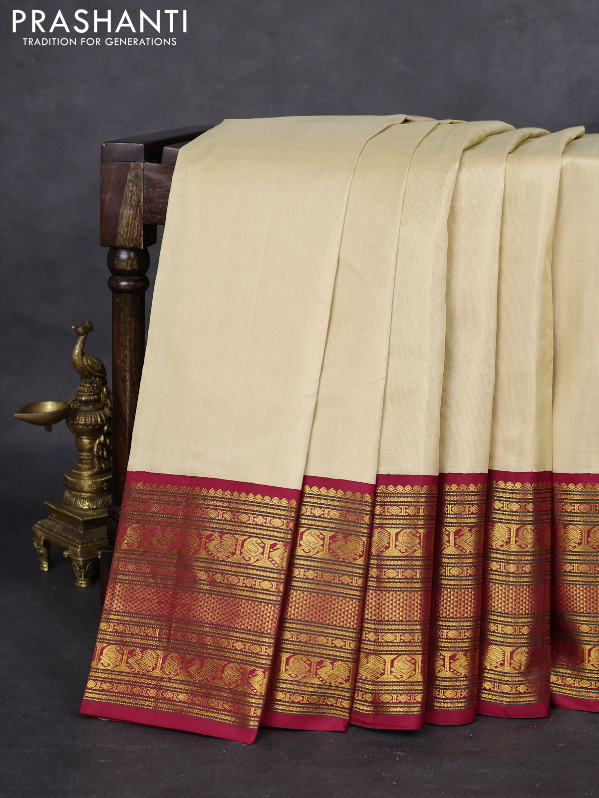Pure kanchipuram silk saree cream and maroon with plain body and long zari woven korvai border