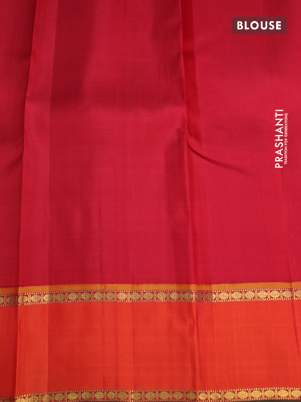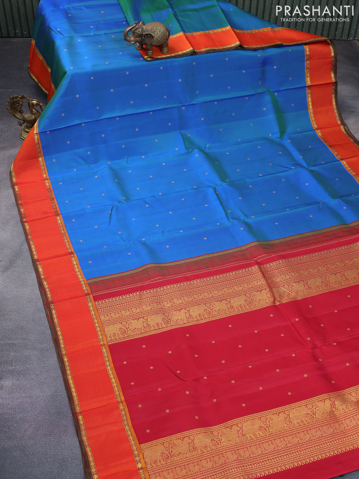 Pure kanchipuram silk saree dual shade of cs blue and orange with zari woven buttas and rettapet zari woven border