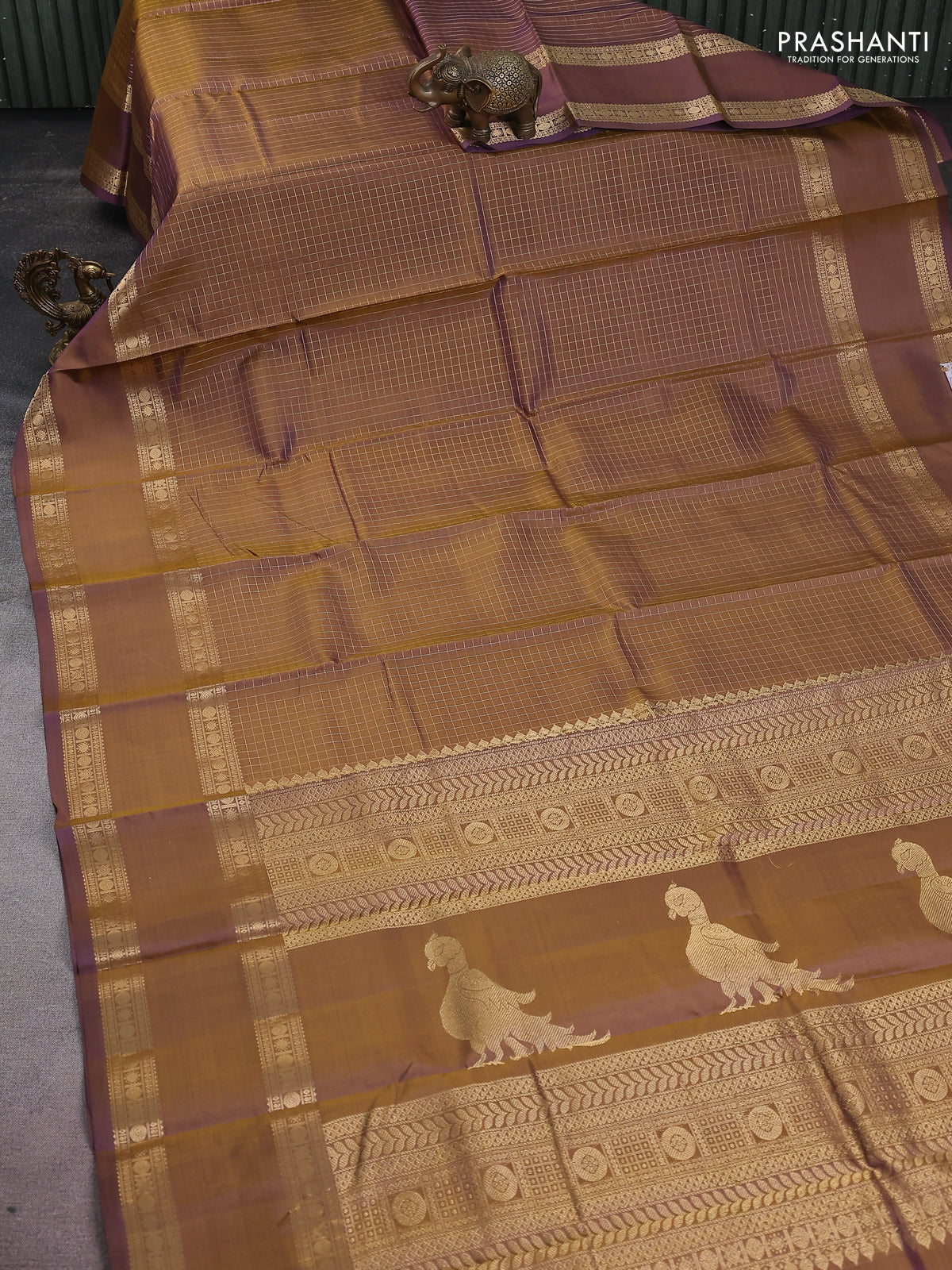 Pure kanchipuram silk saree dual shade of mehendi green and violet with allover zari woven checked pattern and rettapet zari woven border