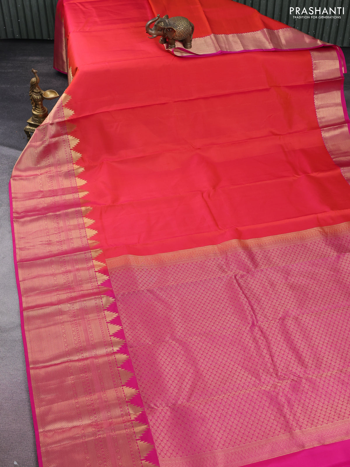 Pure kanchipuram silk saree dual shade of orange and pink with plain body and long temple zari woven border