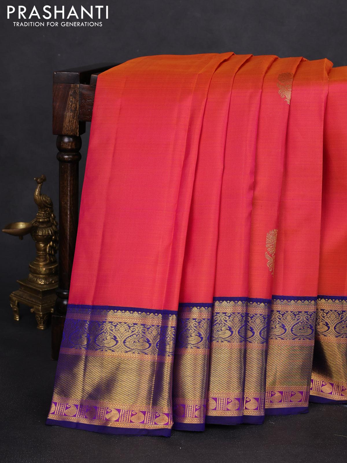 Pure kanchipuram silk saree dual shade of pinkish orange and blue with annam zari woven buttas and zari woven korvai border