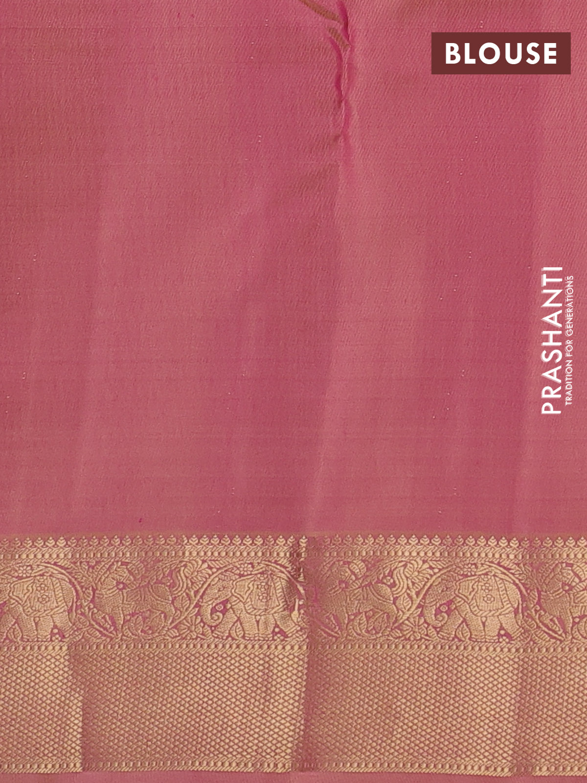 Pure kanchipuram silk saree dual shade of pinkish orange and sandal with allover zari stripe weaves and rich zari woven border