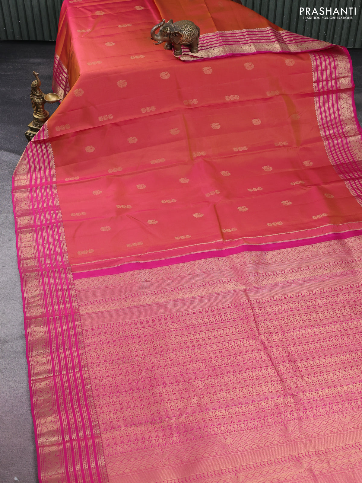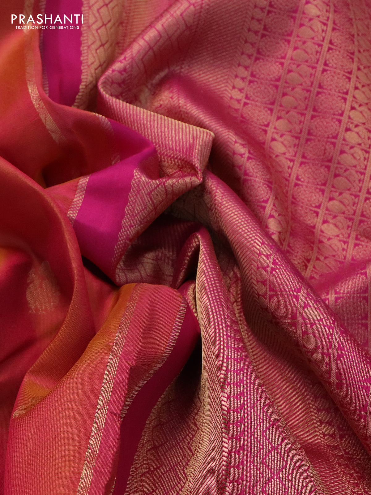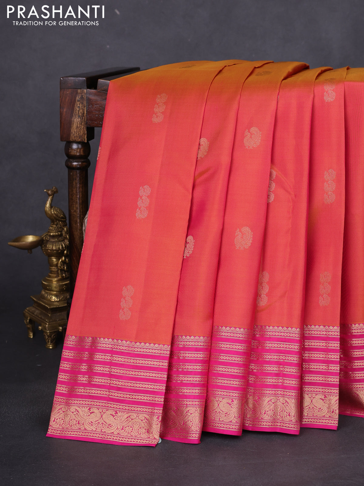 Pure kanchipuram silk saree dual shade of pinkish yellow and pink with zari woven aanam buttas and rich zari woven border
