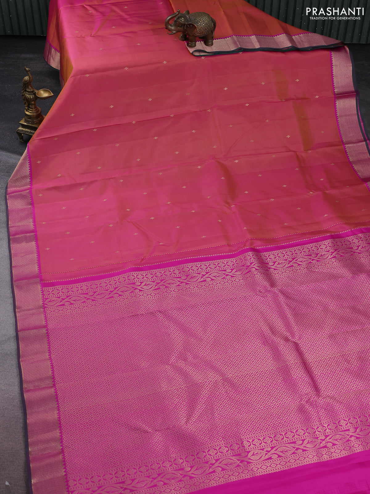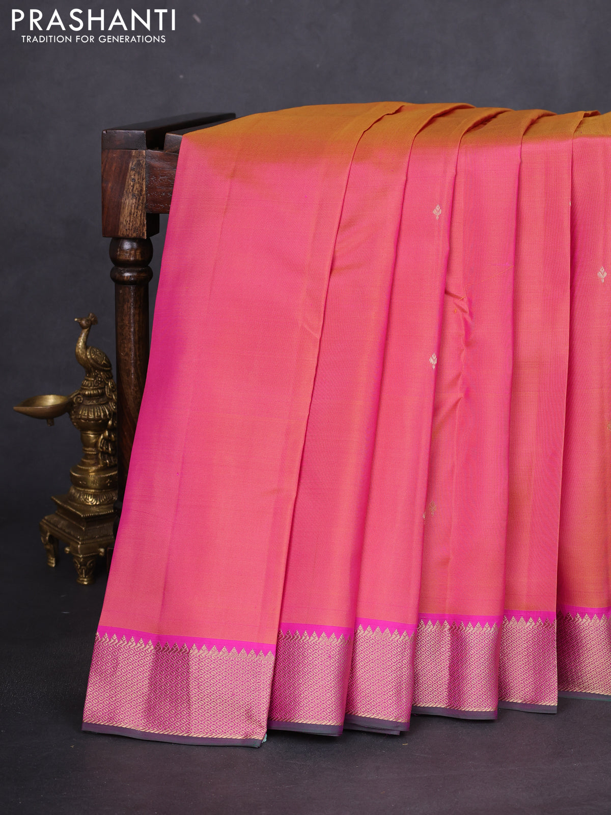 Pure kanchipuram silk saree dual shade of pinkish yellow and pink with zari woven buttas and rich zari woven border