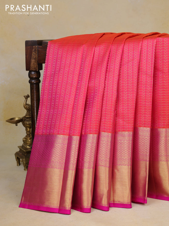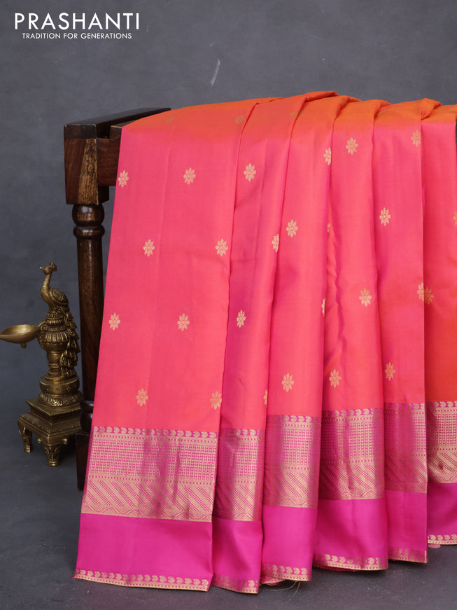 Pure kanchipuram silk saree green and dual shade of pinkish orange with allover zari stripe pattern and rettapet zari woven border