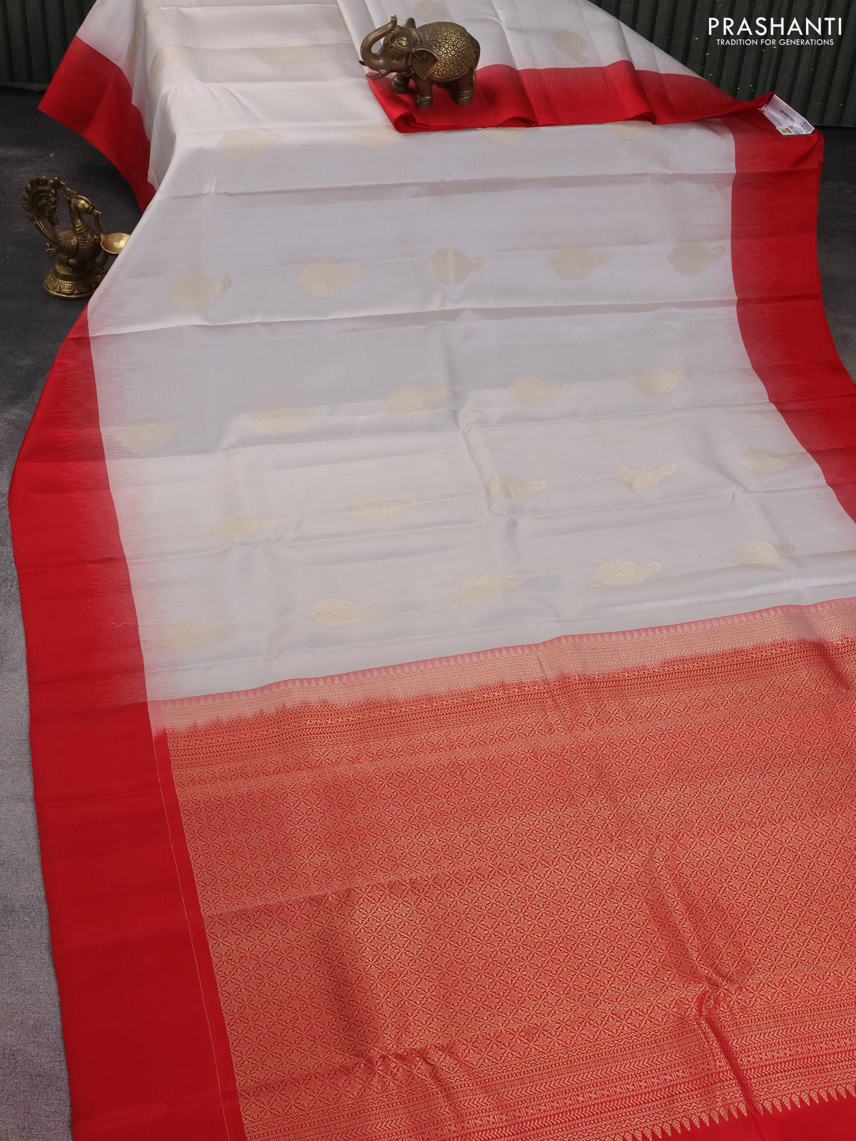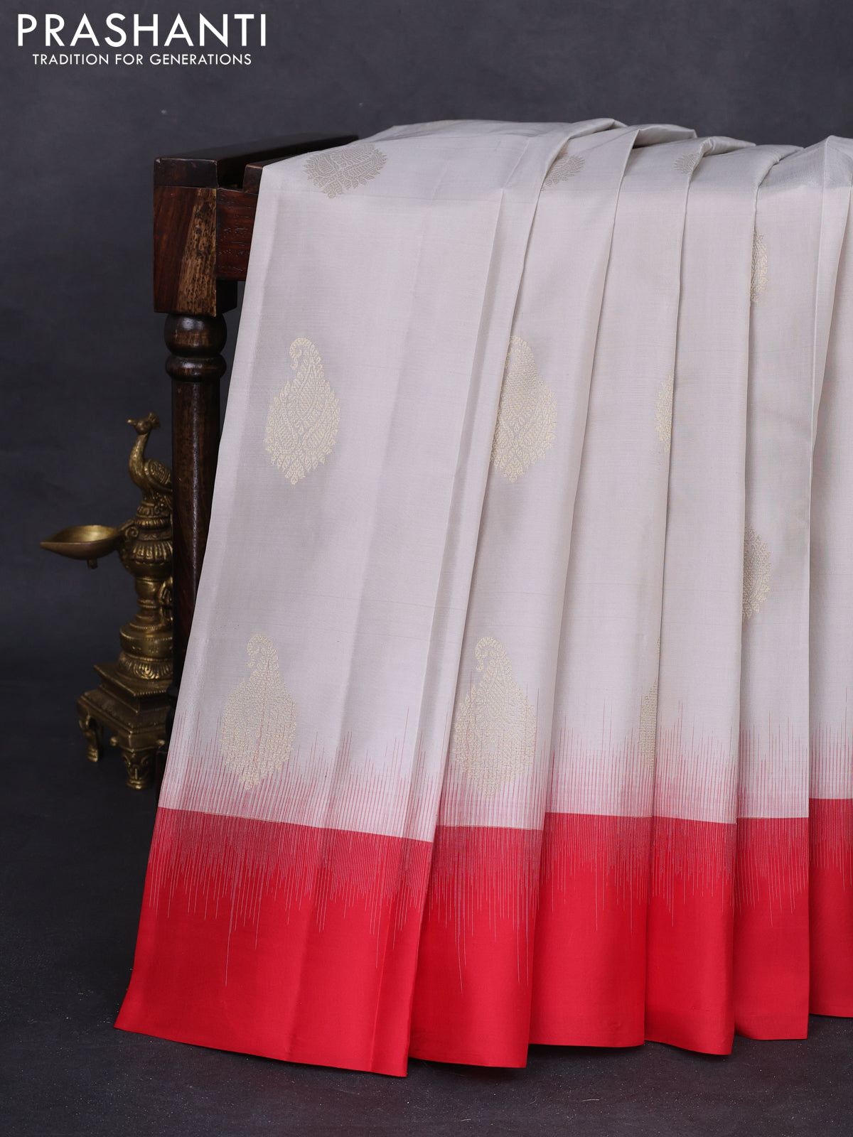 Pure kanchipuram silk saree grey and red with zari woven buttas and simple border