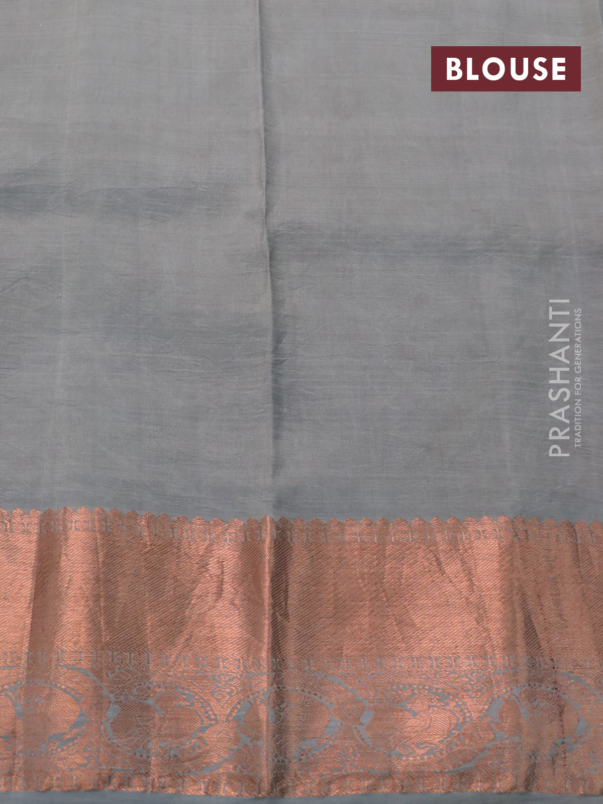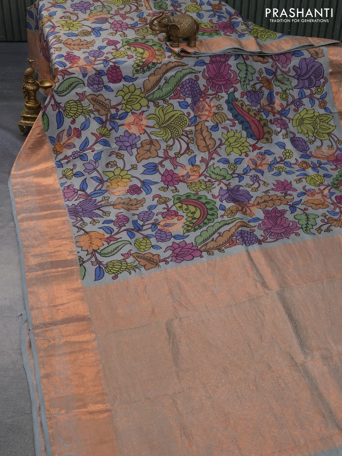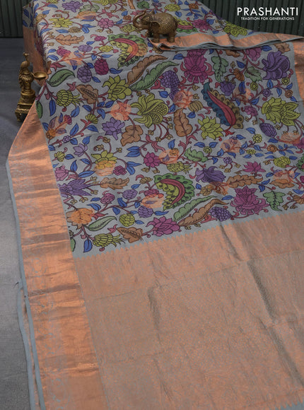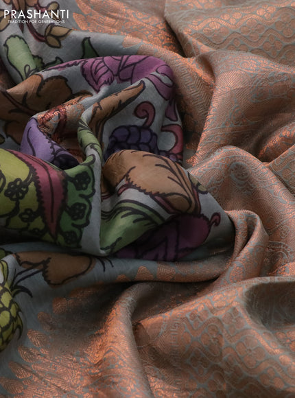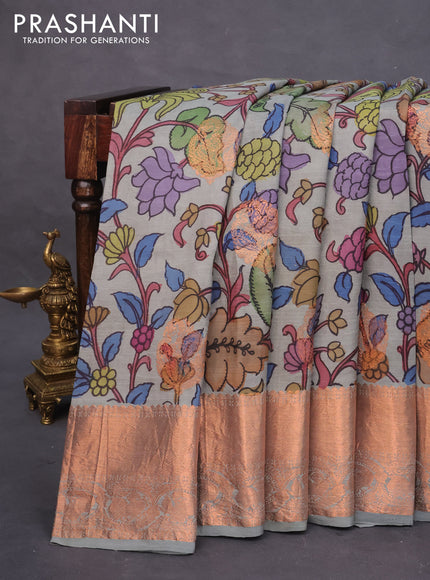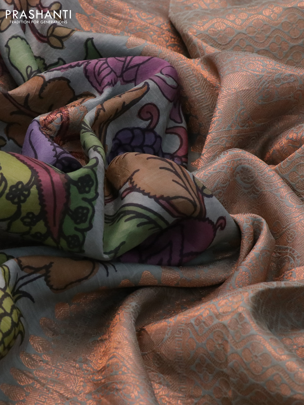 Pure kanchipuram silk saree grey shade with allover pen kalamkari prints & zari buttas and copper zari woven border