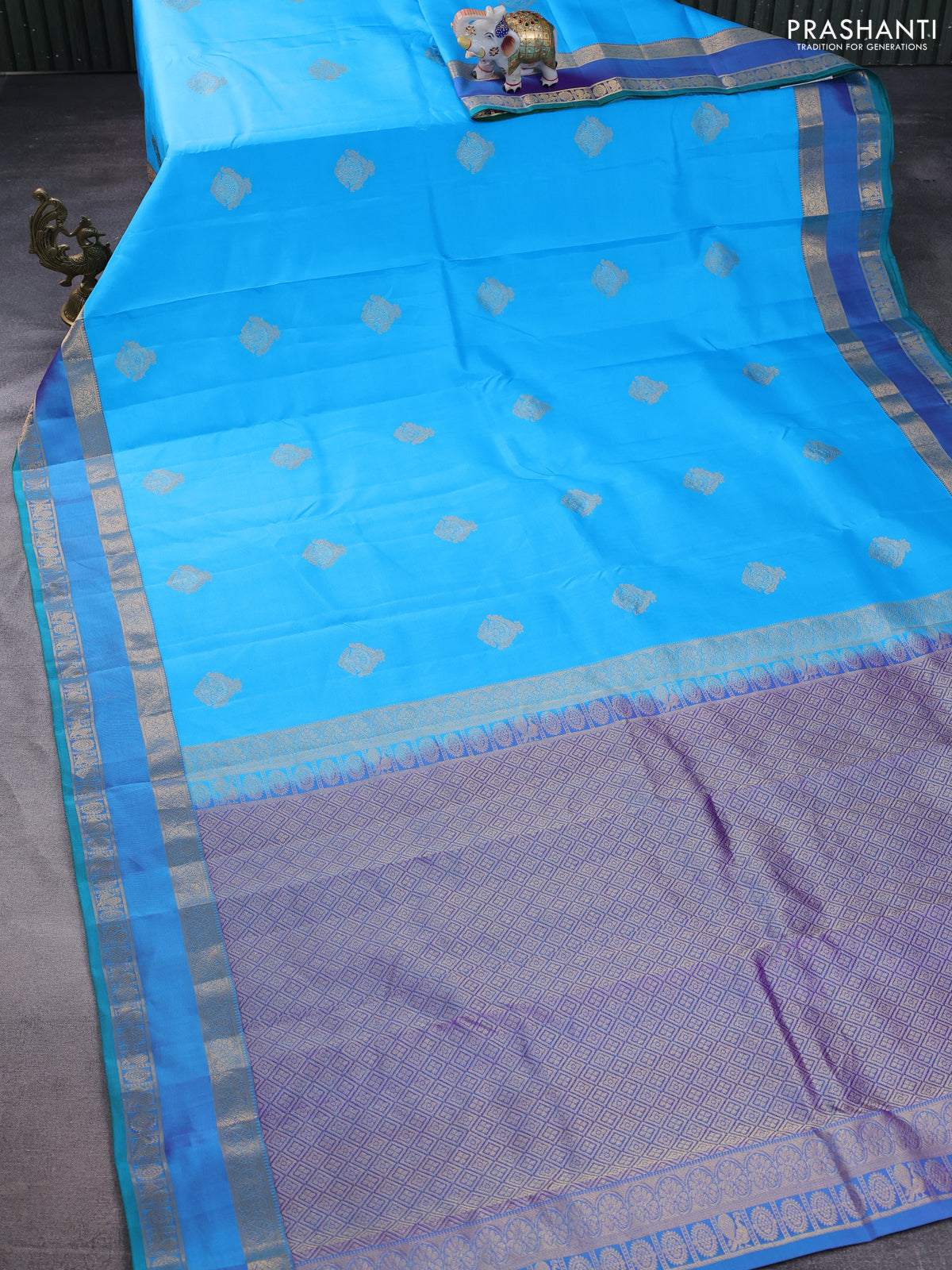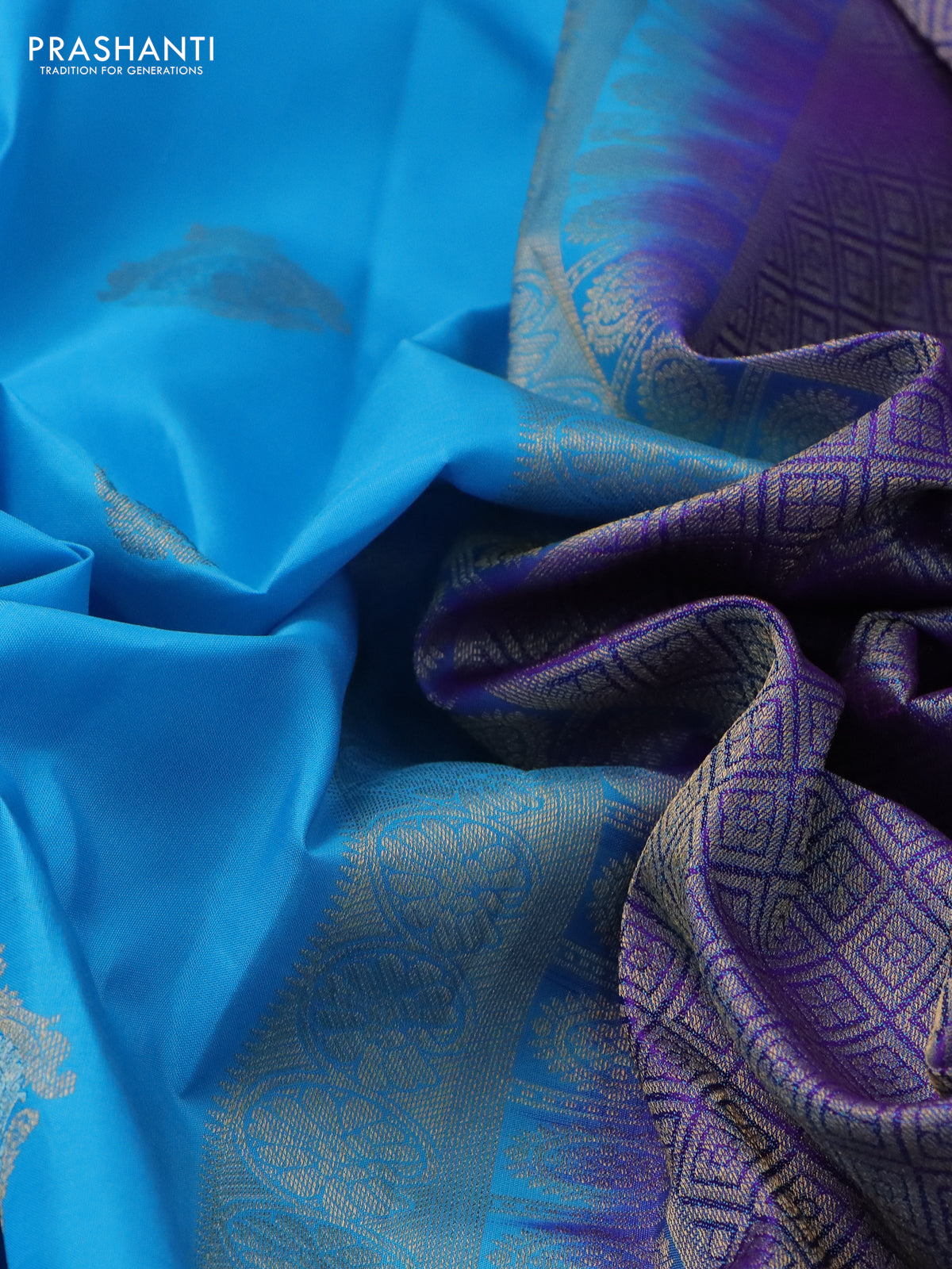 Pure kanchipuram silk saree light blue and dual shade of purple with zari woven buttas and rettapet zari woven border