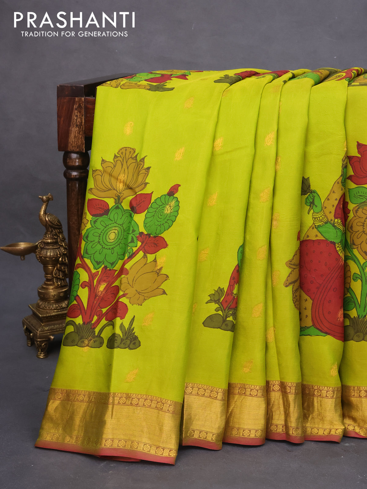 Pure kanchipuram silk saree light green and pink with allover pen kalamkari prints & zari buttas and zari woven border