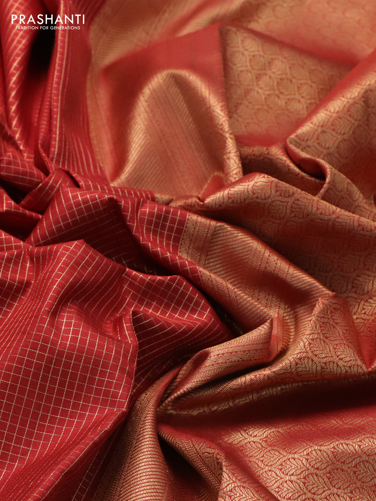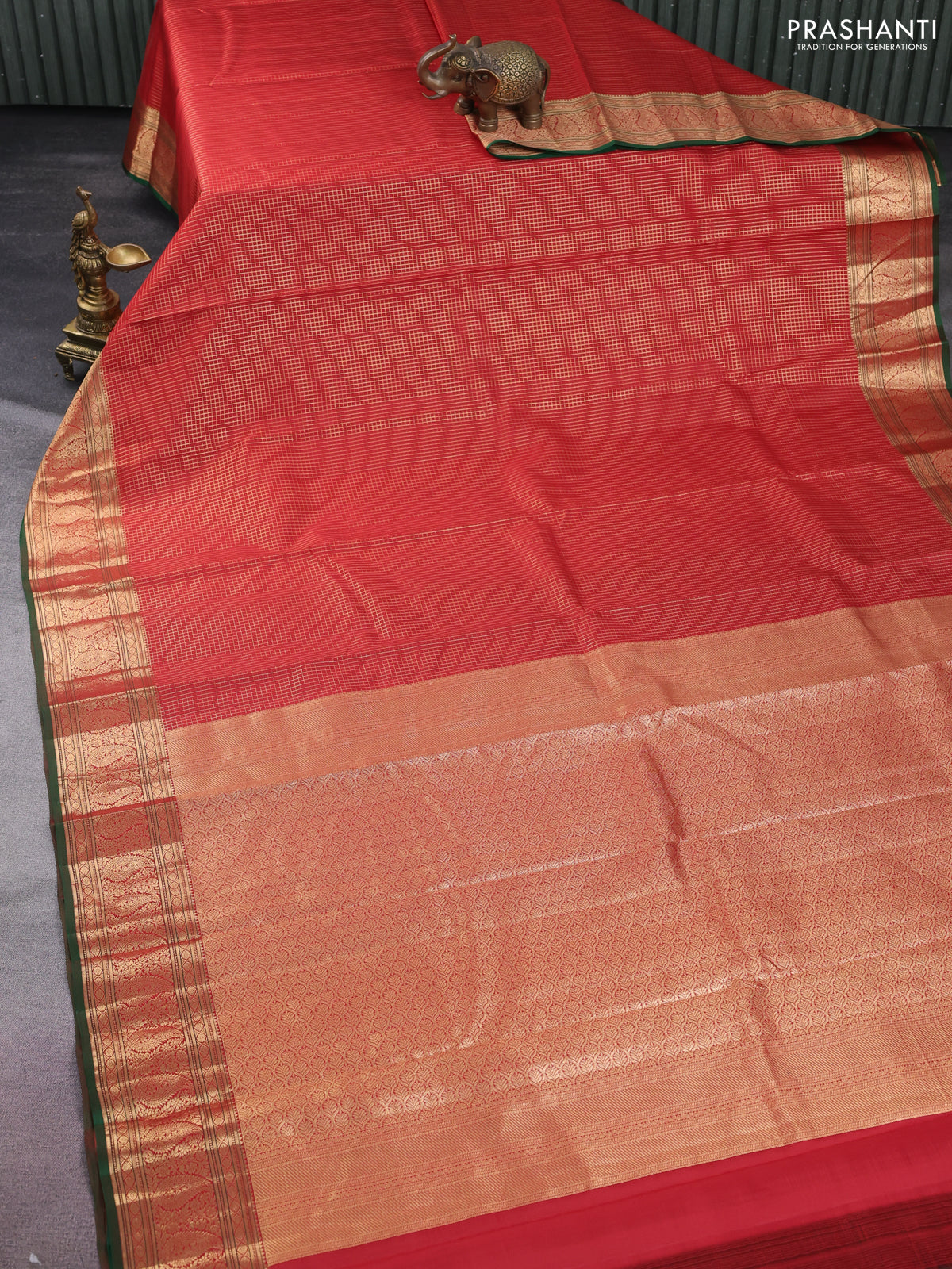 Pure kanchipuram silk saree maroon and green with allover small zari checked pattern and rich zari woven border