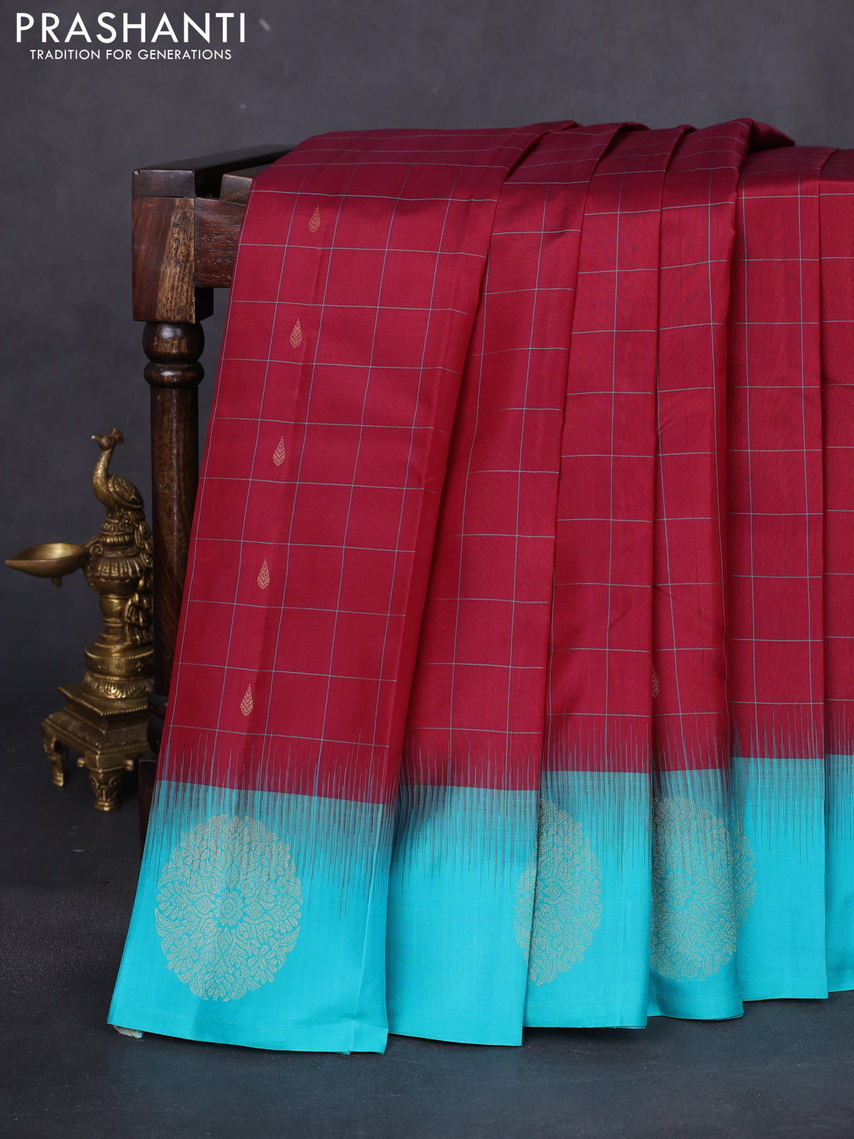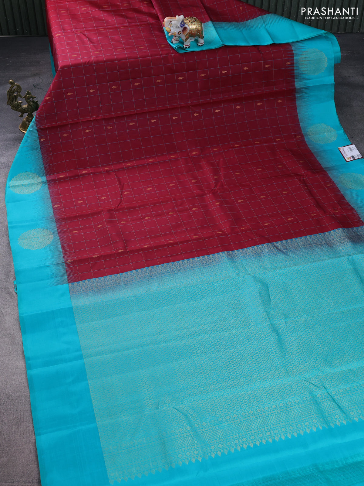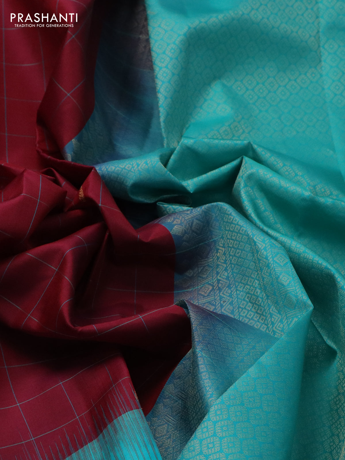 Pure kanchipuram silk saree maroon and teal blue with allover checks & zari buttas and zari woven butta border