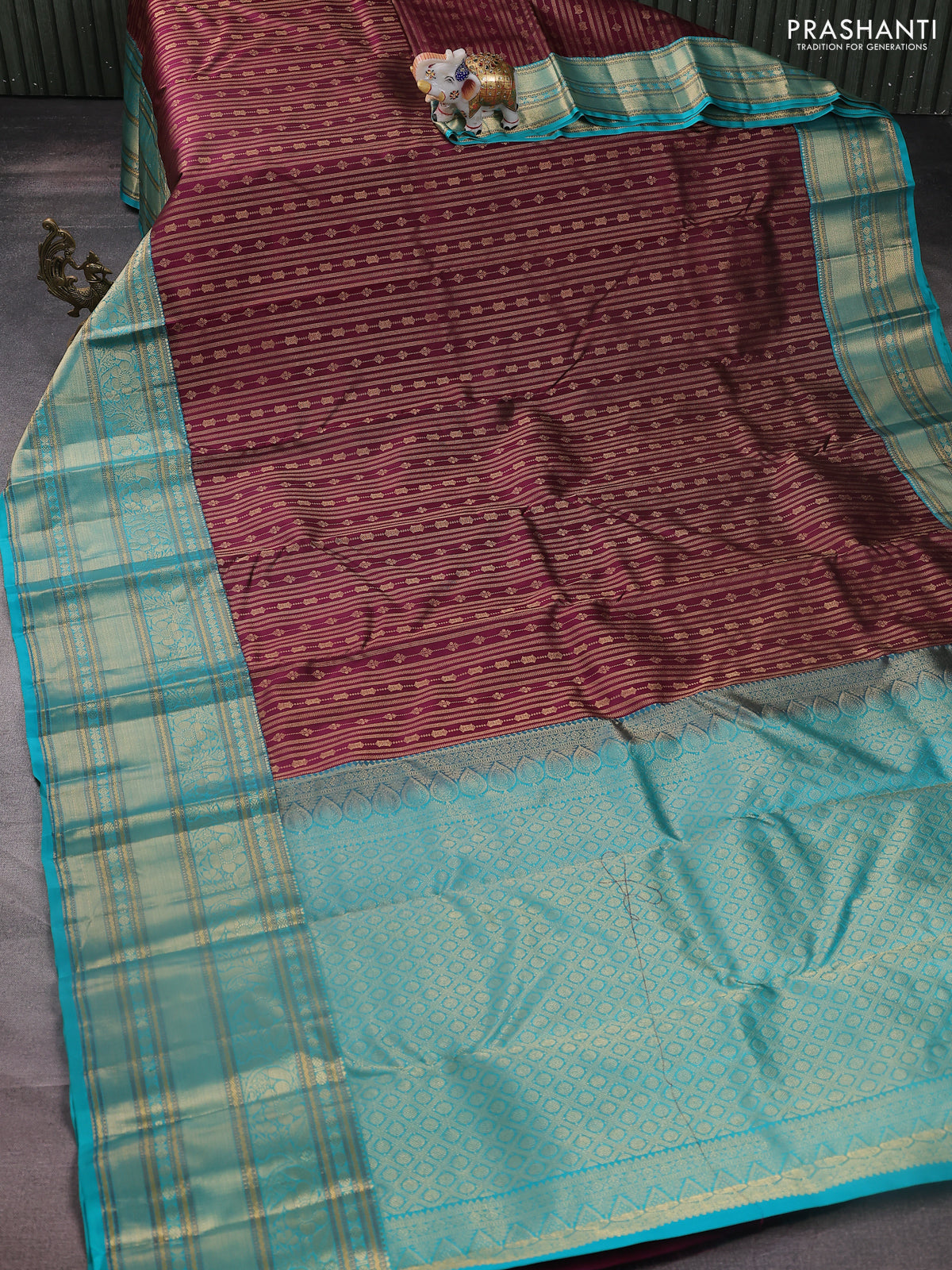 Pure kanchipuram silk saree maroon and teal blue with allover zari woven stripes pattern and zari woven border