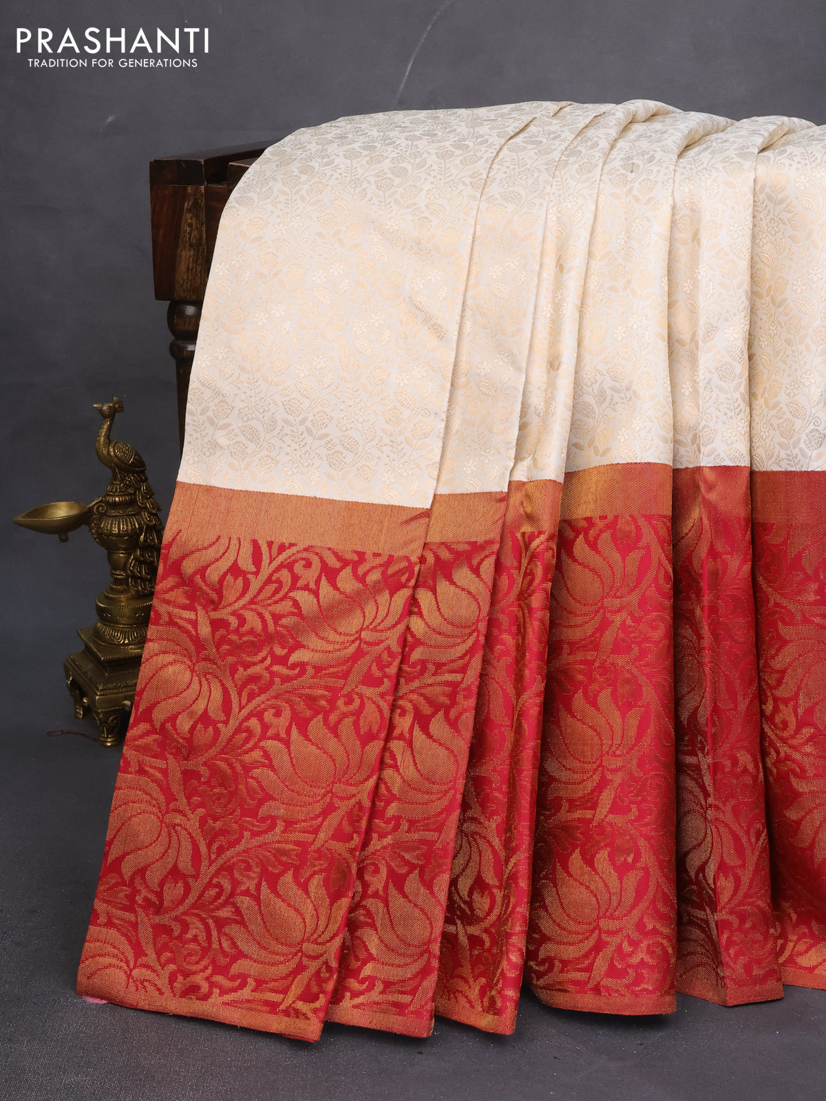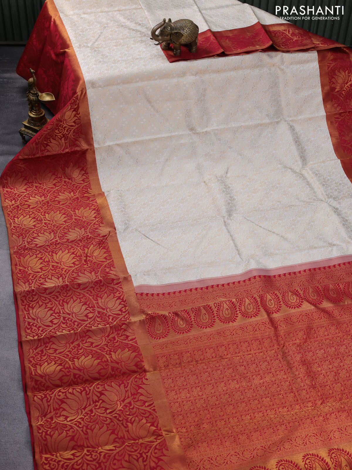 Pure kanchipuram silk saree off white and maroon with allover zari woven brocade weaves and long rich zari woven border
