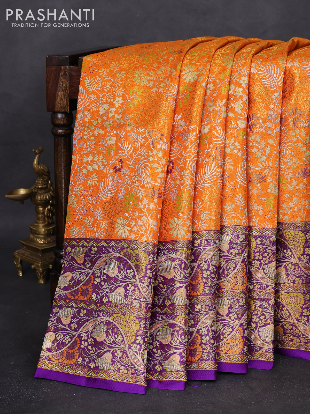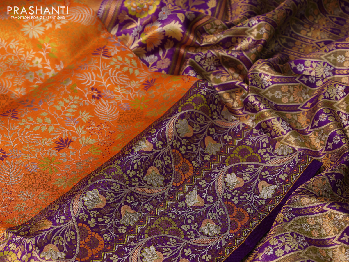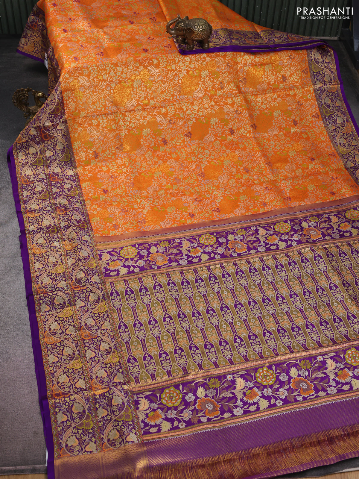 Pure Kanchipuram silk saree orange and violet with allover zari woven brocade weaves and long zari woven mina border