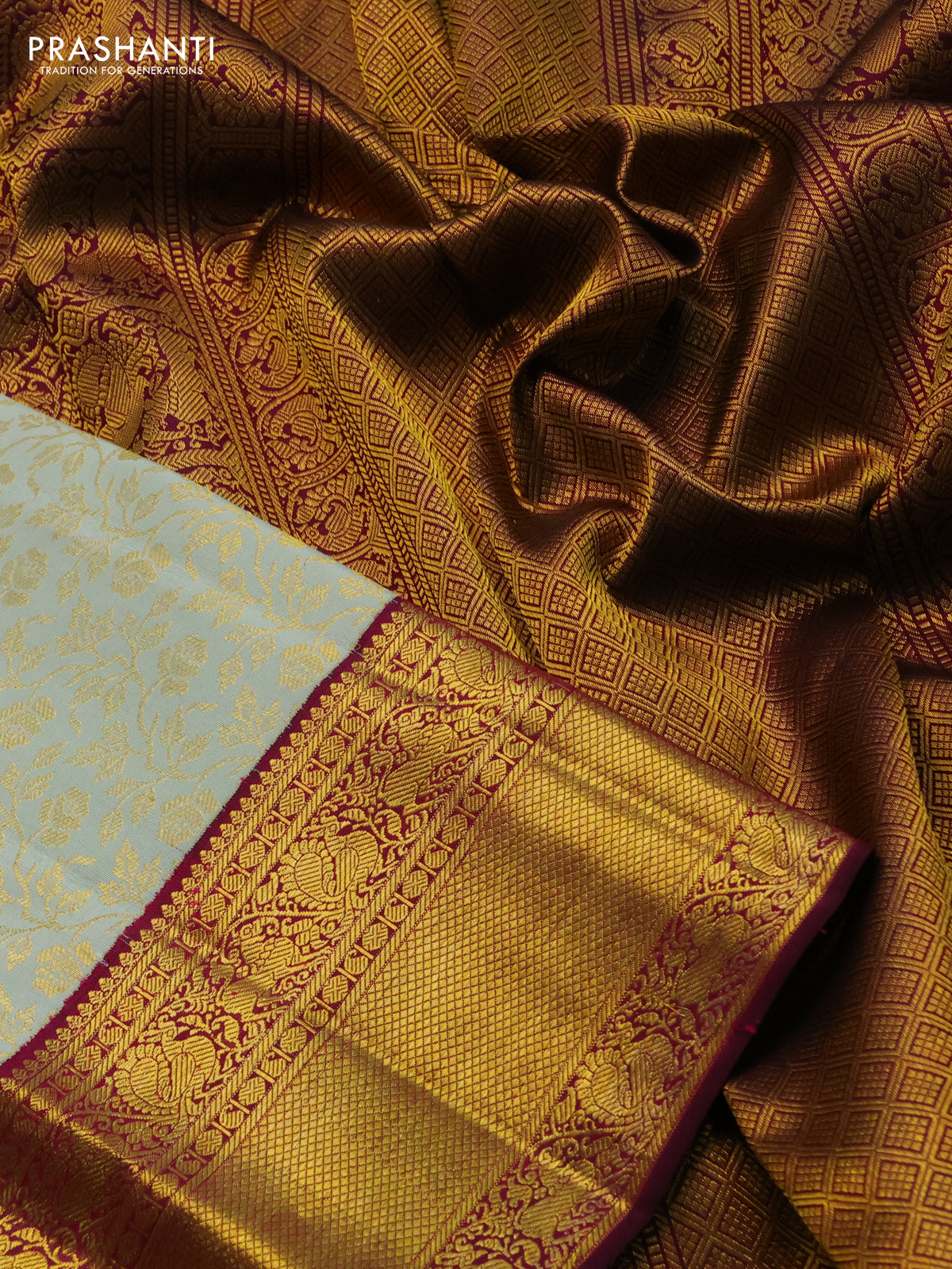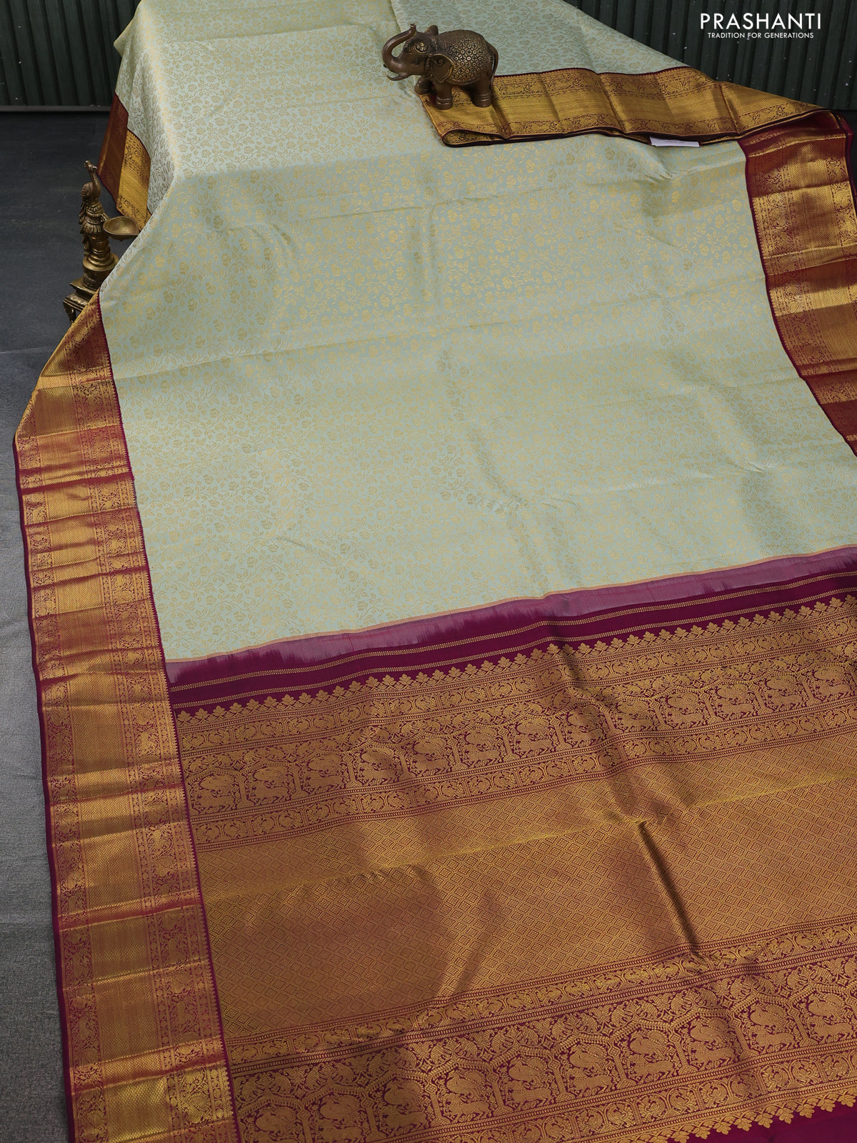 Pure kanchipuram silk saree pastel green and dark magenta pink with allover zari woven brocade weaves and zari woven border