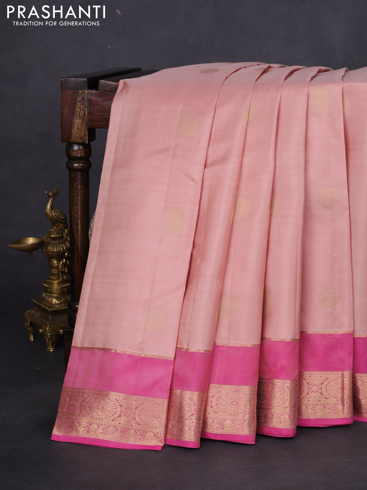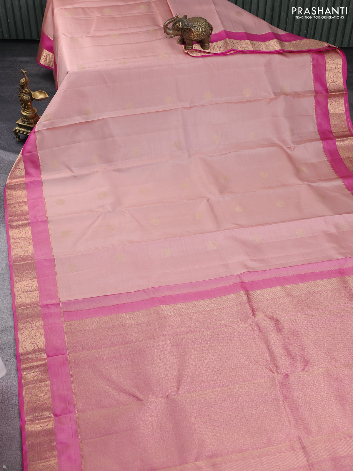 Pure kanchipuram silk saree pastel peach shade and pink with zari woven buttas and rettapet zari woven border