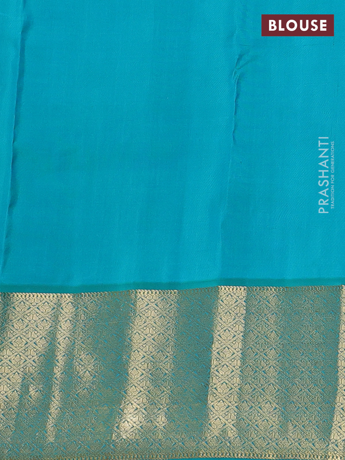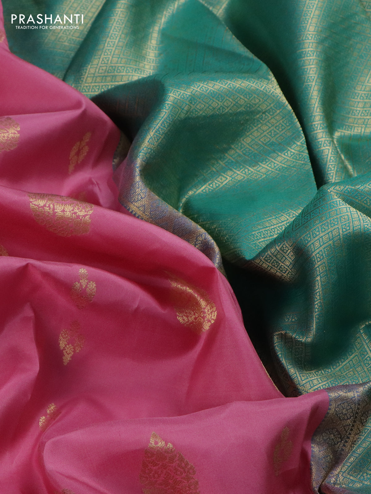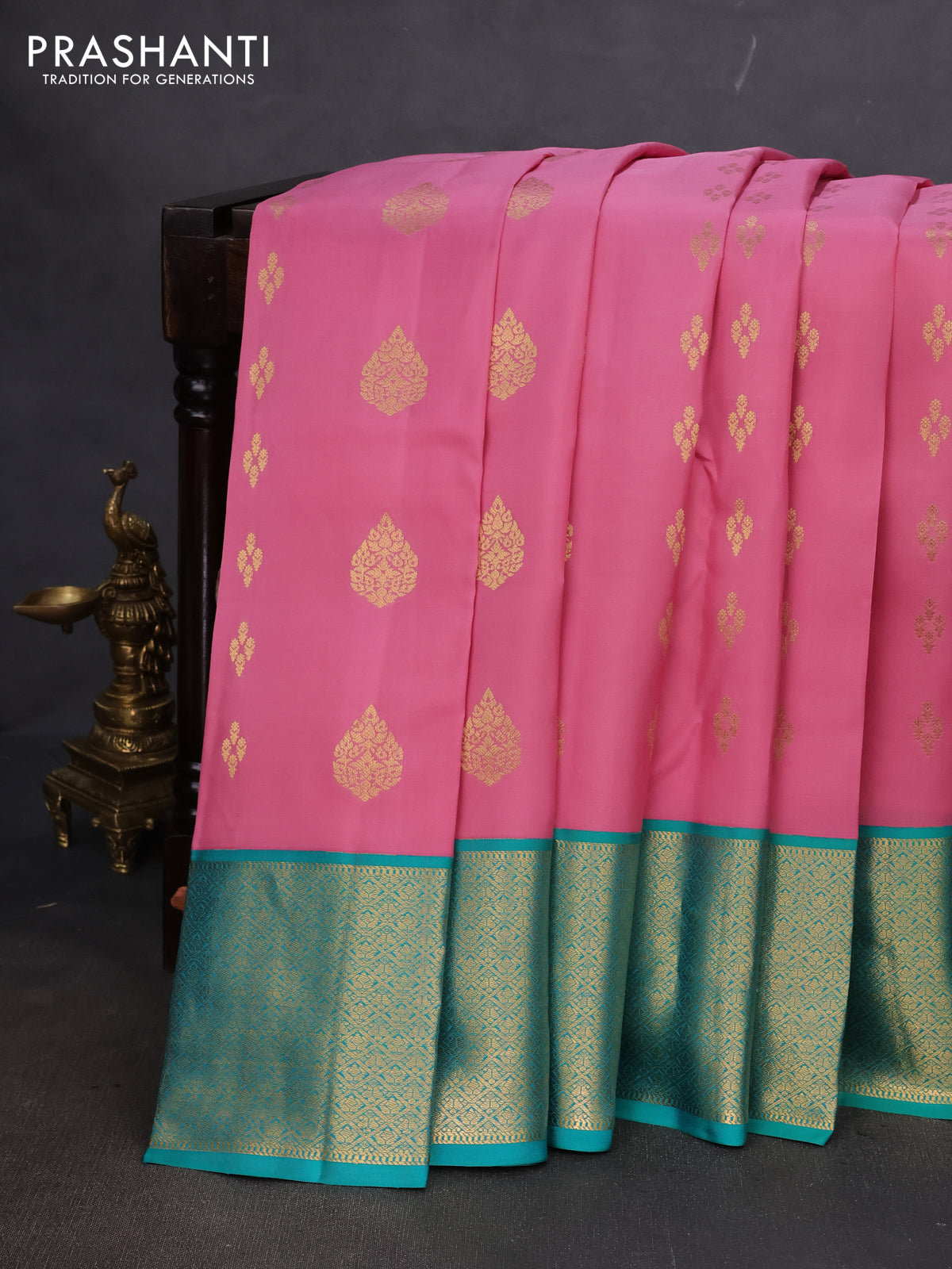 Pure kanchipuram silk saree peach pink and teal green shade with zari woven buttas and zari woven korvai buttas