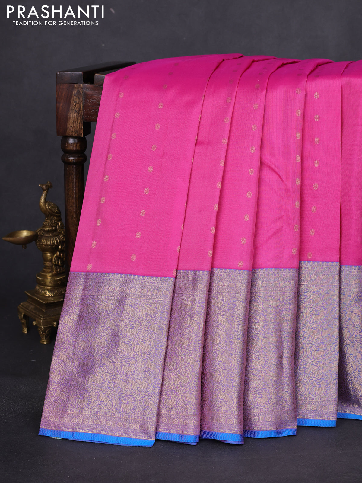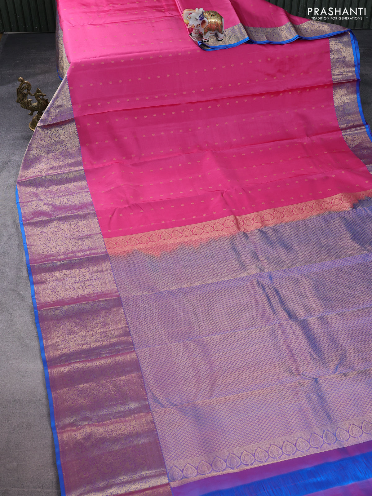Pure kanchipuram silk saree pink shade and dual shade of blue with allover zari woven buttas and long zari woven korvai border