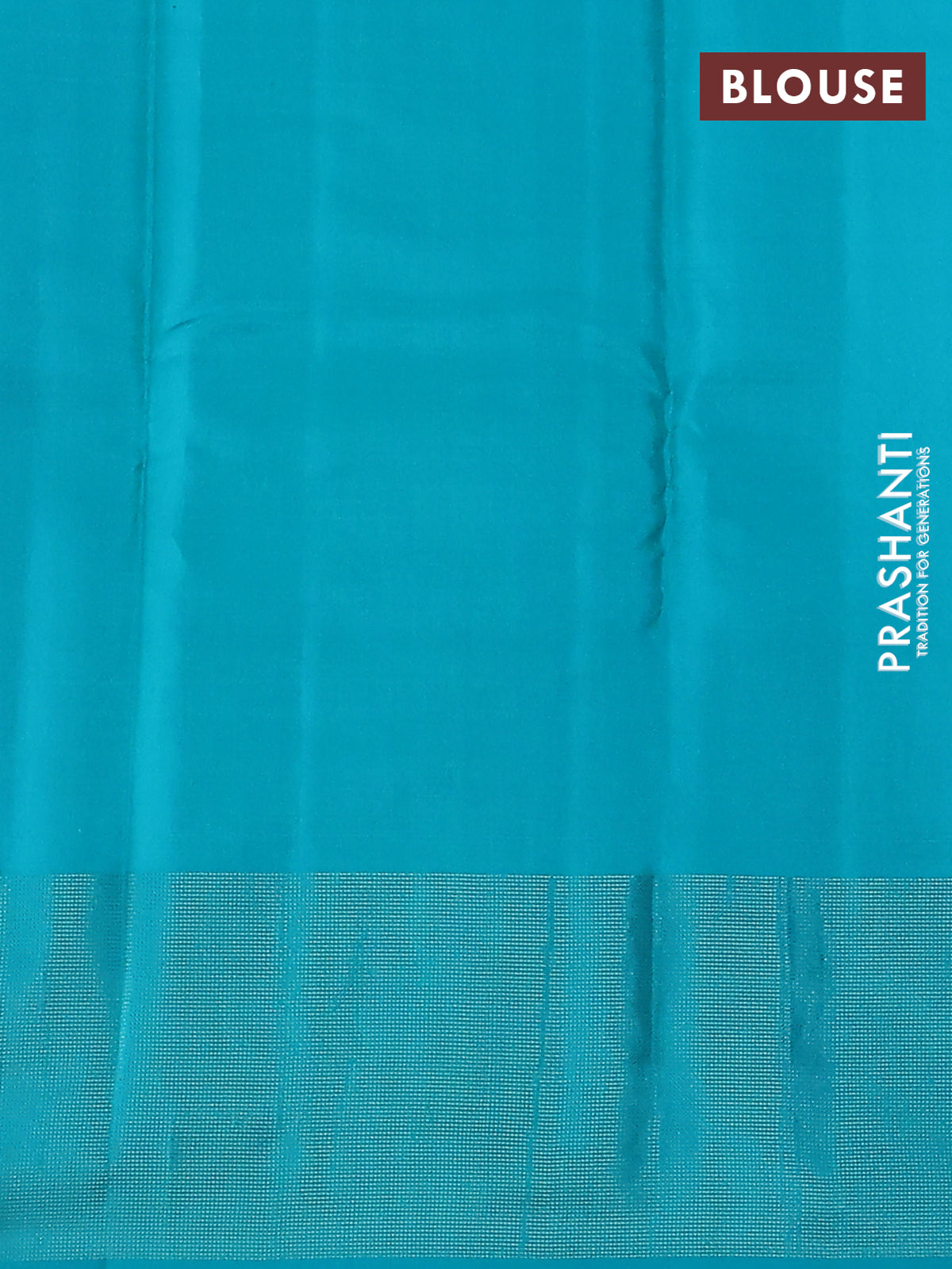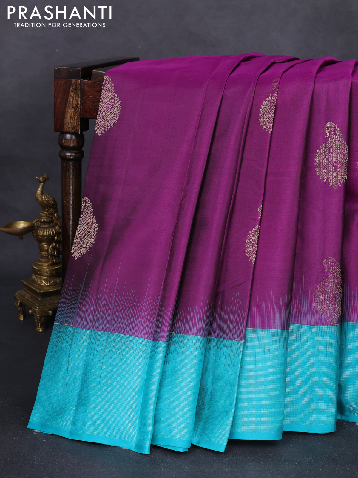 Pure kanchipuram silk saree purple and teal blue with zari woven buttas and simple zari border