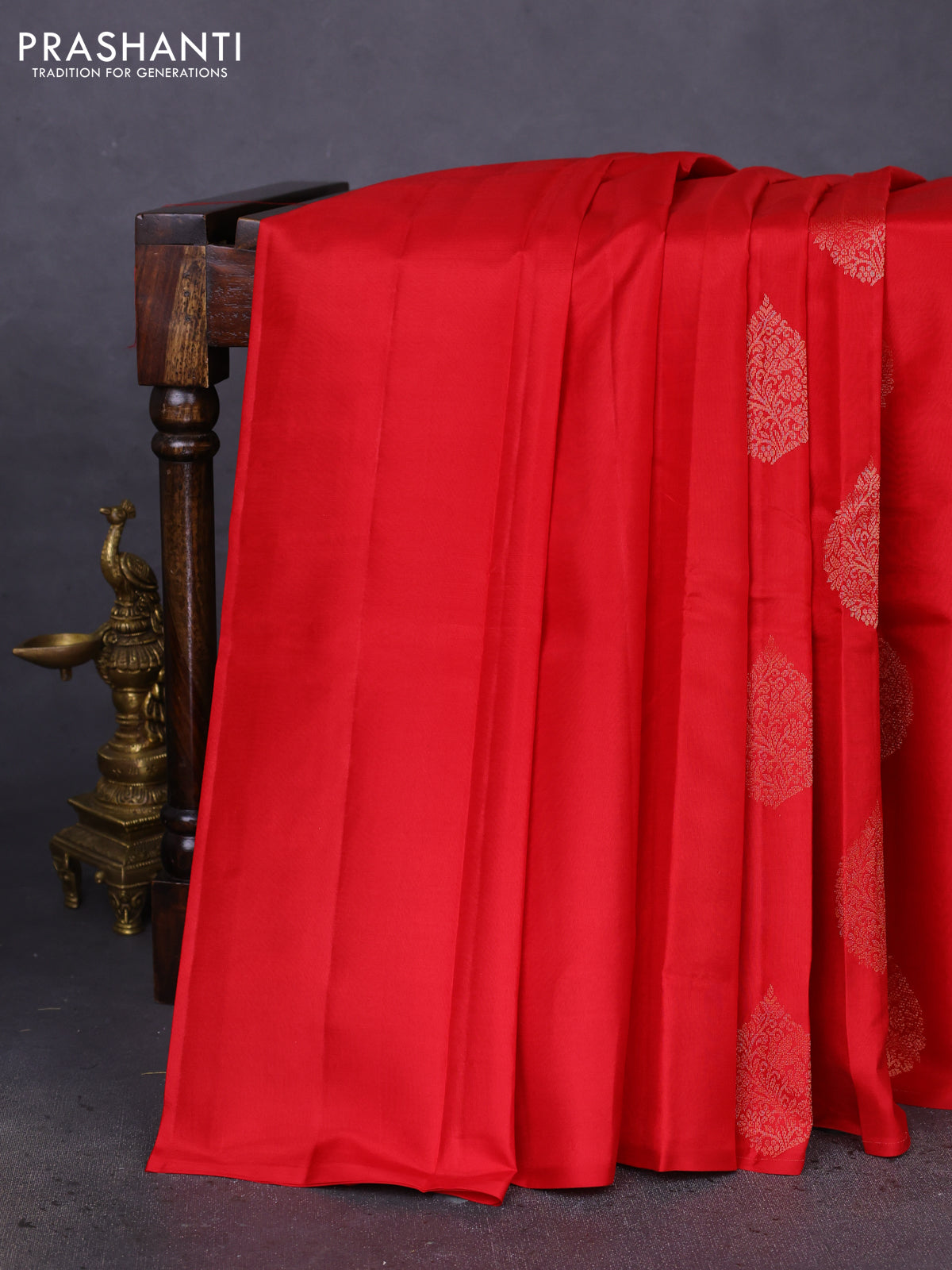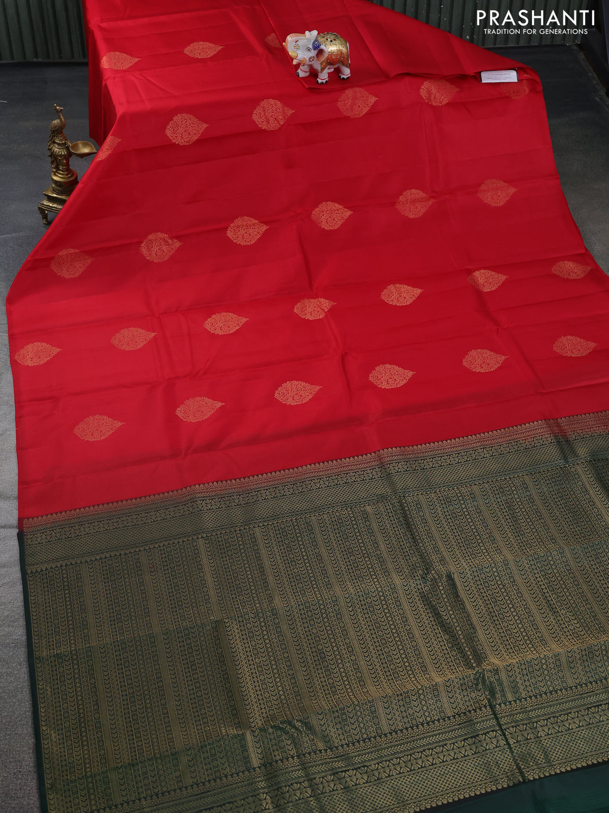 Pure kanchipuram silk saree red and bottle green with zari woven buttas in borderless style