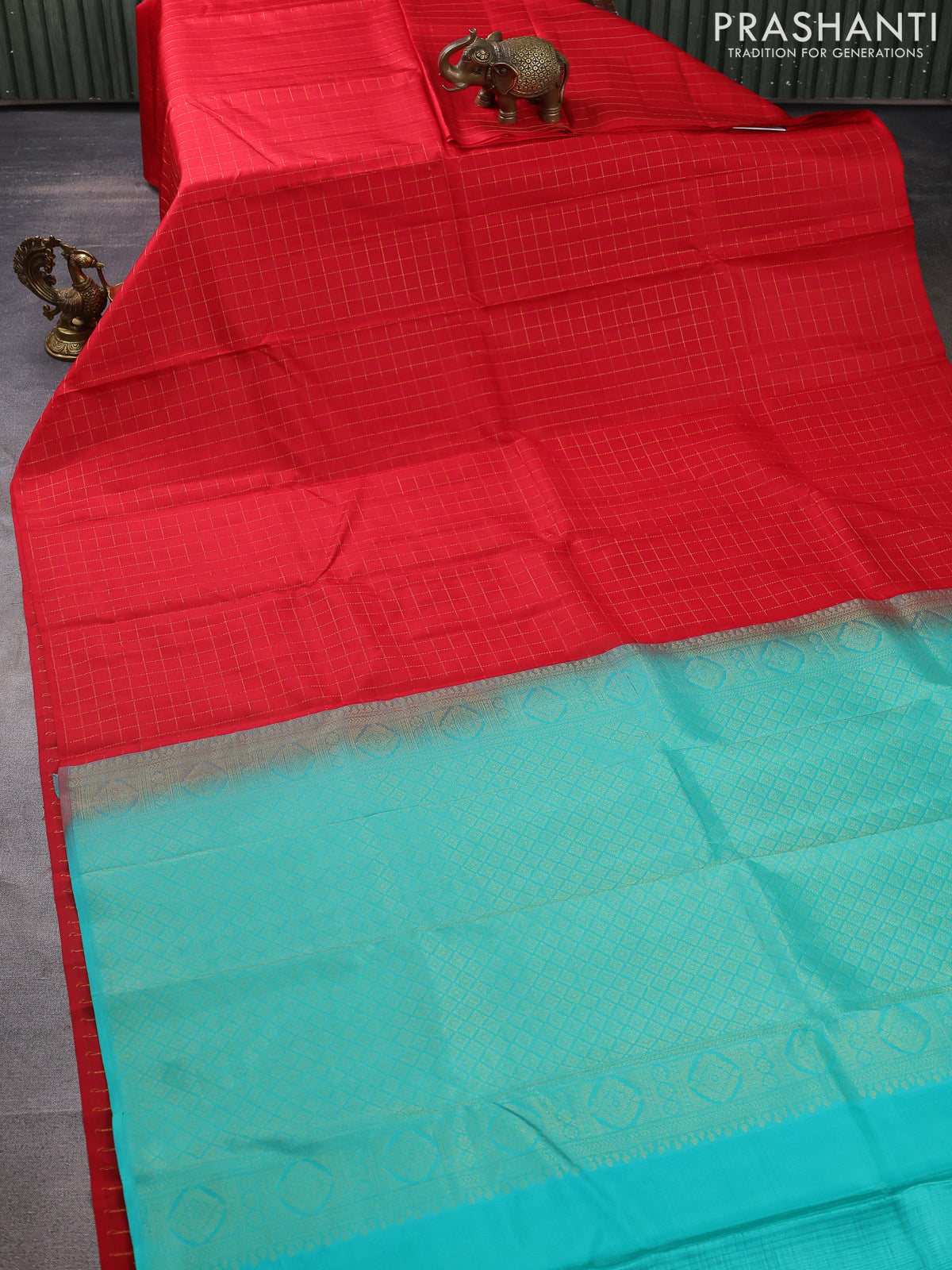 Pure kanchipuram silk saree red and teal blue with allover zari checked pattern in borderless style