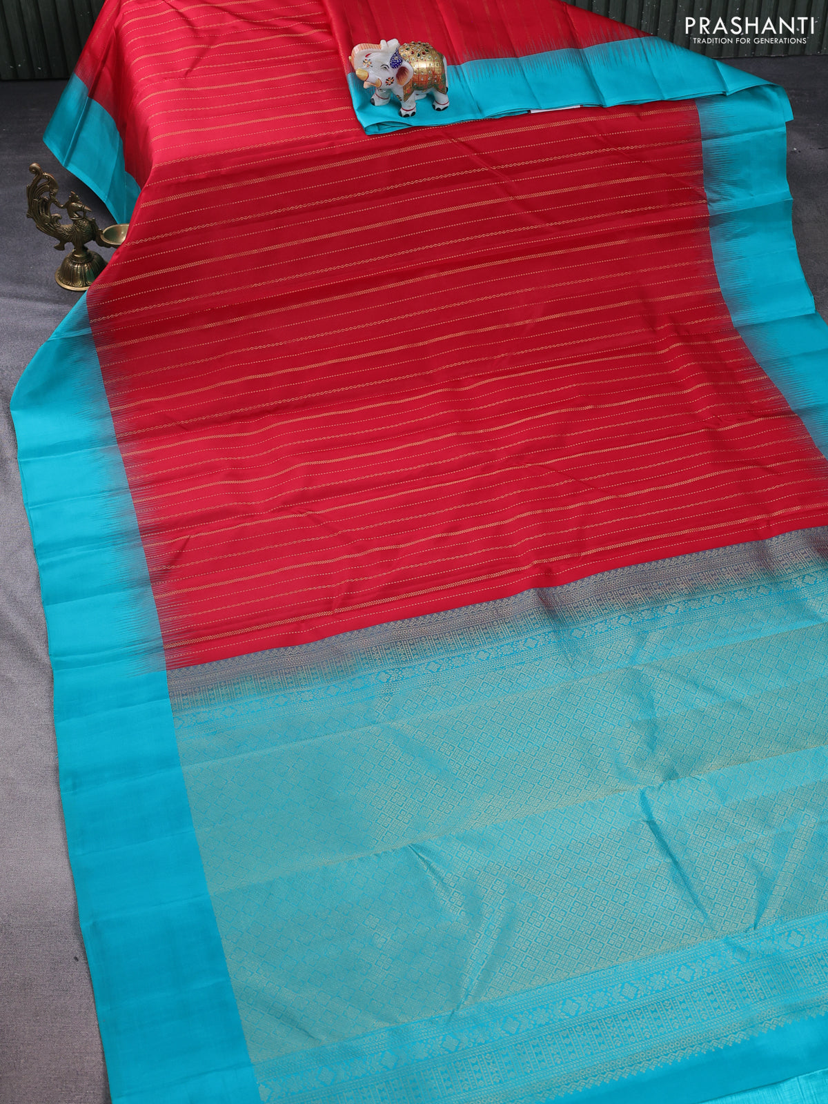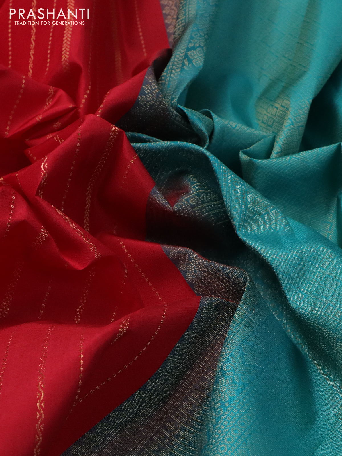 Pure kanchipuram silk saree red and teal blue with allover zari weaves and simple border
