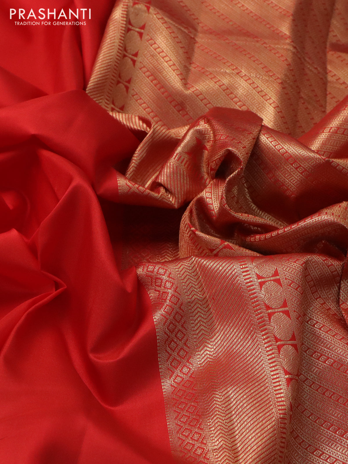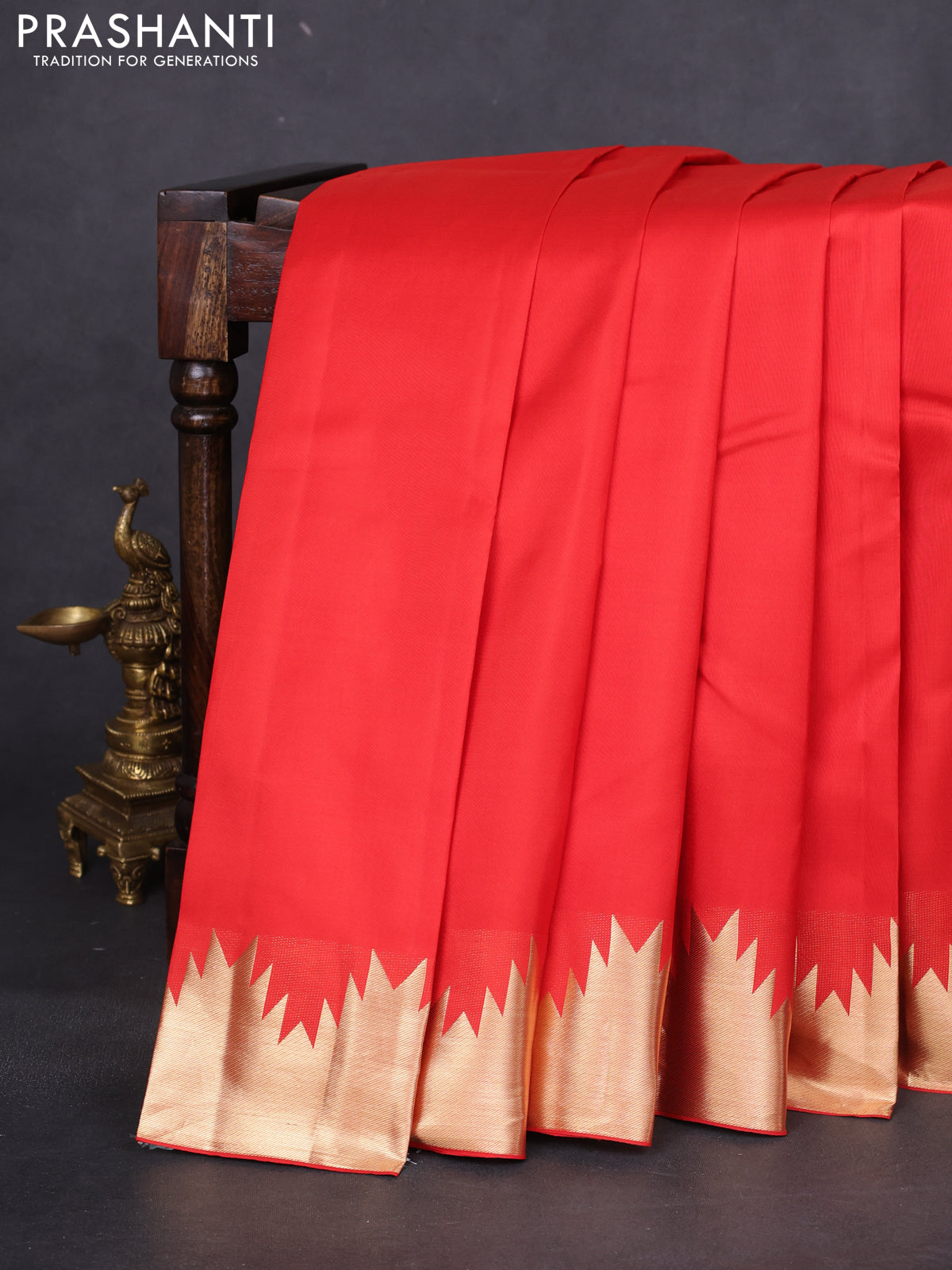 Pure kanchipuram silk saree red with plain body and temple zari woven border