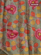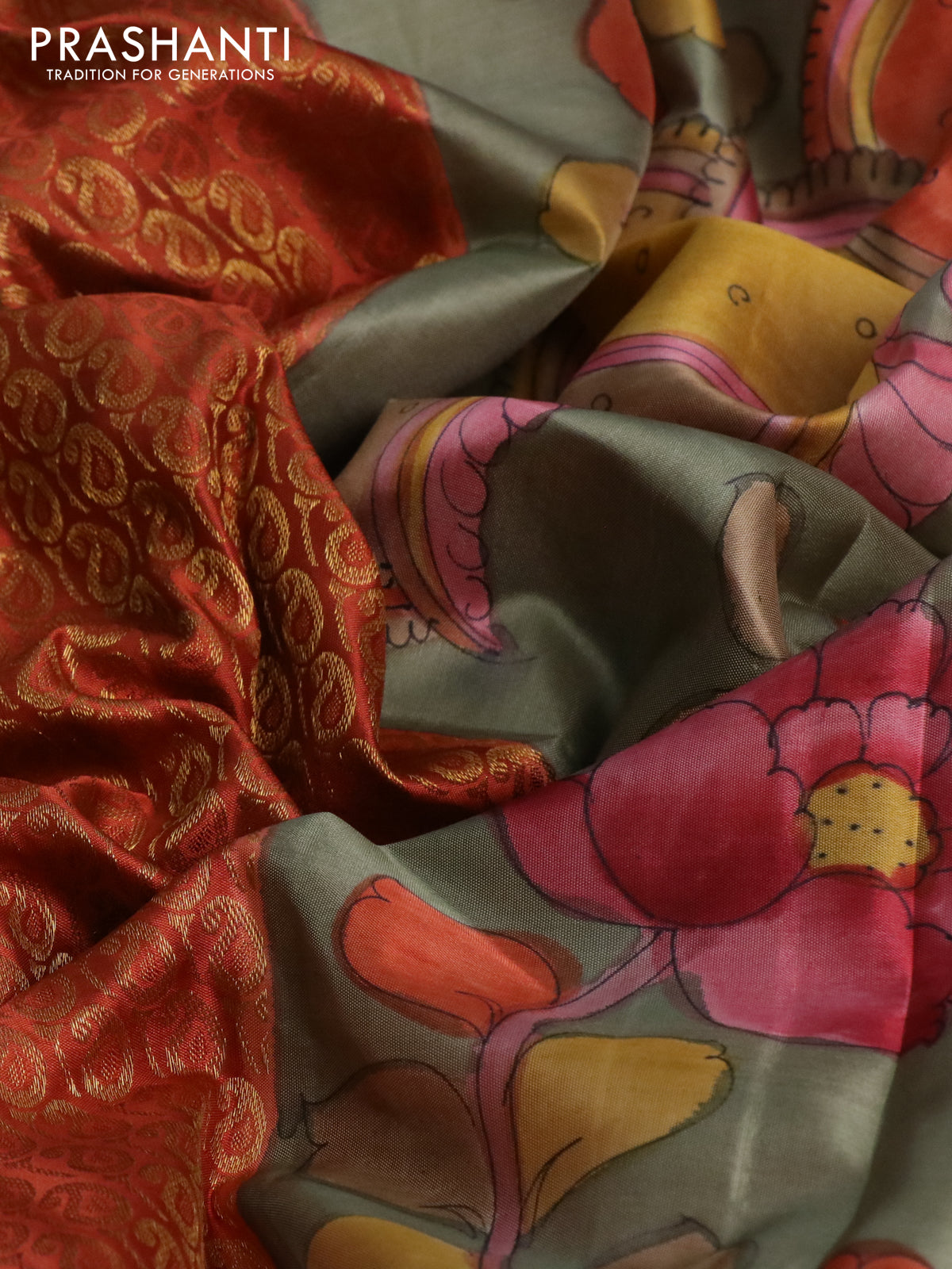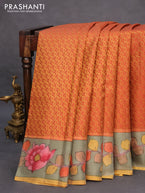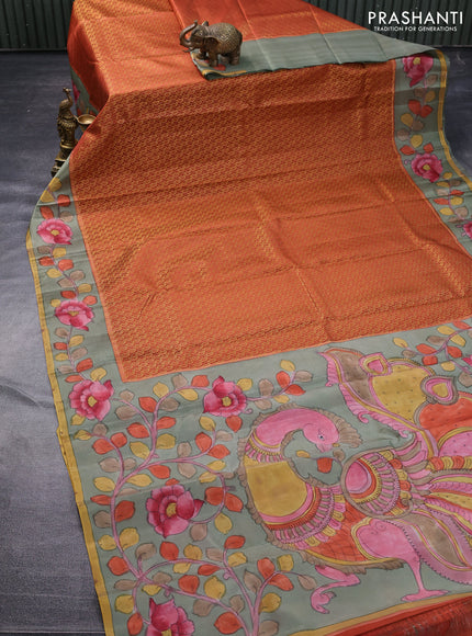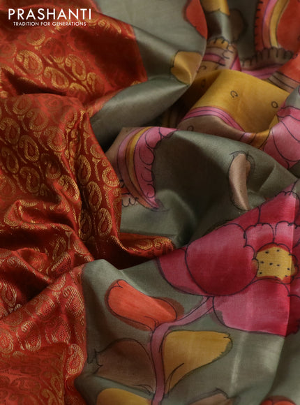 Pure kanchipuram silk saree rustic orange and grey shade with allover zari woven paisley brocade weaves and kalamkari printed pallu & border