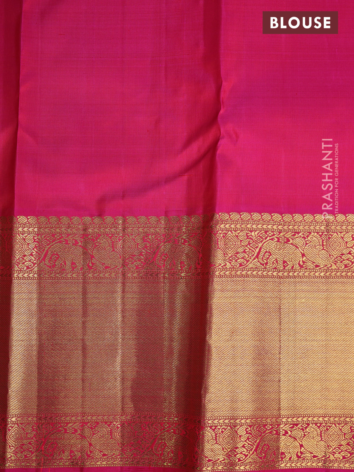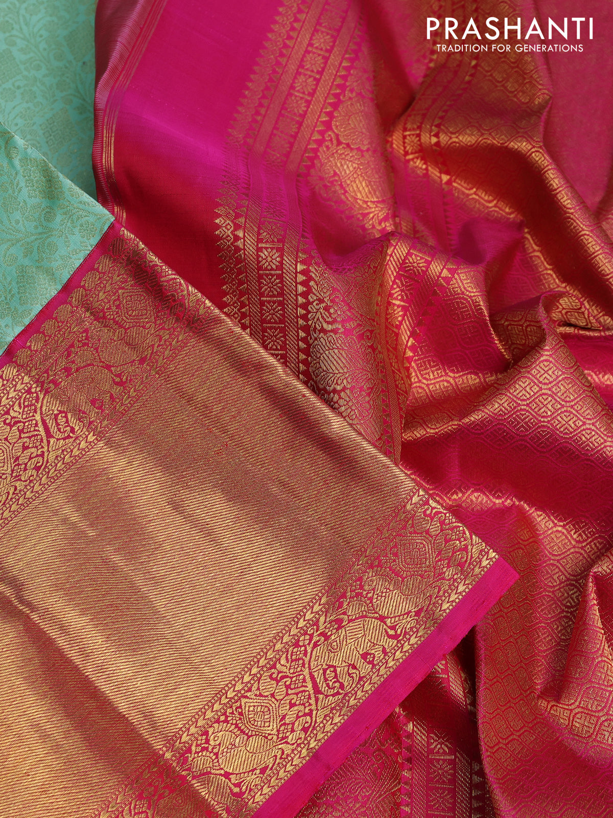 Pure kanchipuram silk saree teal shade and pink with allover zari woven brocade weaves and long zari woven korvai border