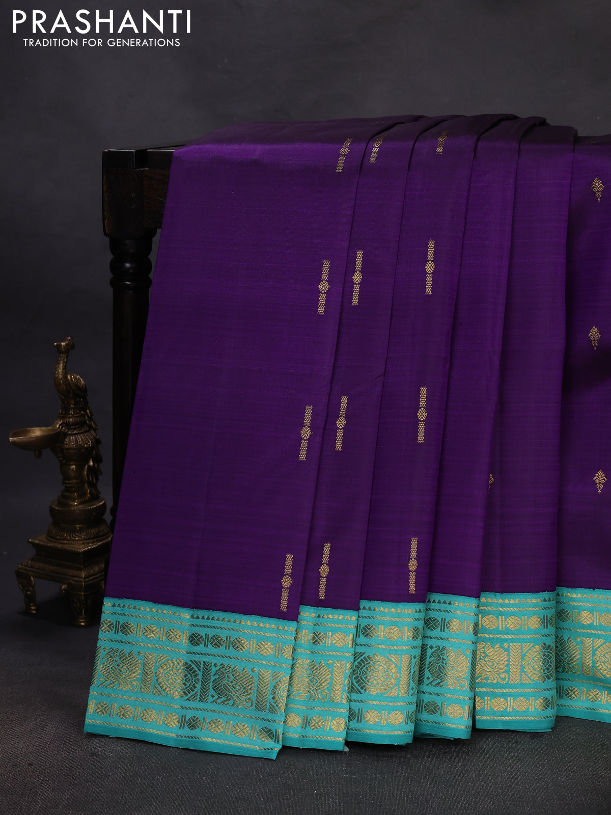 Pure kanchipuram silk saree violet and teal green shade with zari woven buttas and rich zari woven korvai border