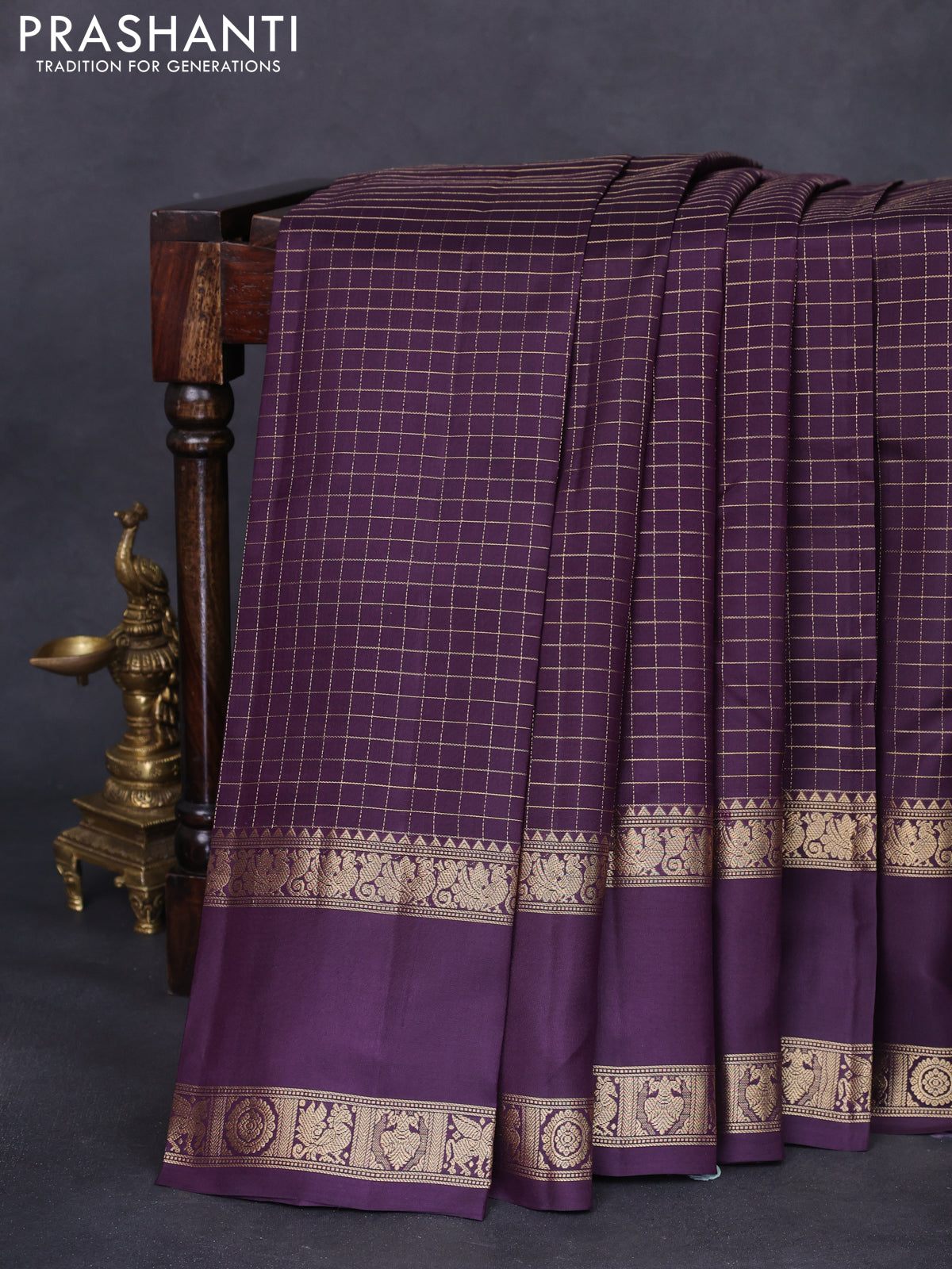 Pure kanchipuram silk saree wine shade with allover zari woven checked pattern and rettapet zari woven border